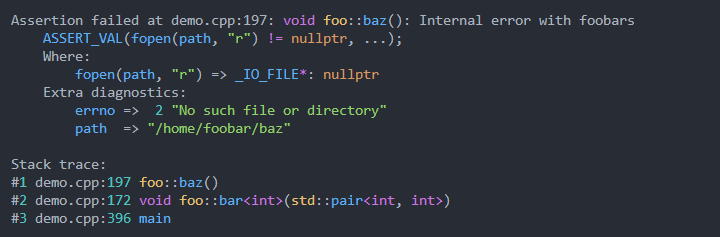 FILE* f = ASSERT_VAL(fopen(path, " r " ) != nullptr , " Internal error with foobars " , errno, path); Se proporciona un manejo especial para errno , y Strerror se llama automáticamente.