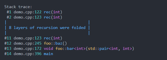 Se ha realizado mucho trabajo para generar trazas de pila bonitas y formatearlos lo más bien posible. CPPTRACE se usa como una solución portátil y autónoma para las pilas pre-C ++ 23. Las configuraciones opcionales se pueden encontrar en la documentación de la biblioteca.