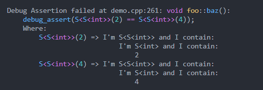 ** : assert(expression && "message") se usa comúnmente, pero esto es sub-ideal y solo permite mensajes literarios de cadena.