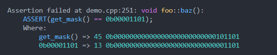 Los valores de afirmación se imprimen en hexadecimal o binario, así como decimal si hex/binario se usan a ambos lados de una expresión de afirmación:
