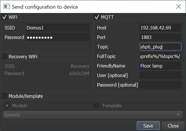 Envoyer une configuration à un périphérique flashé via la série: configuration en un clic du wifi (y compris la récupération AP), MQTT, module et / ou modèle