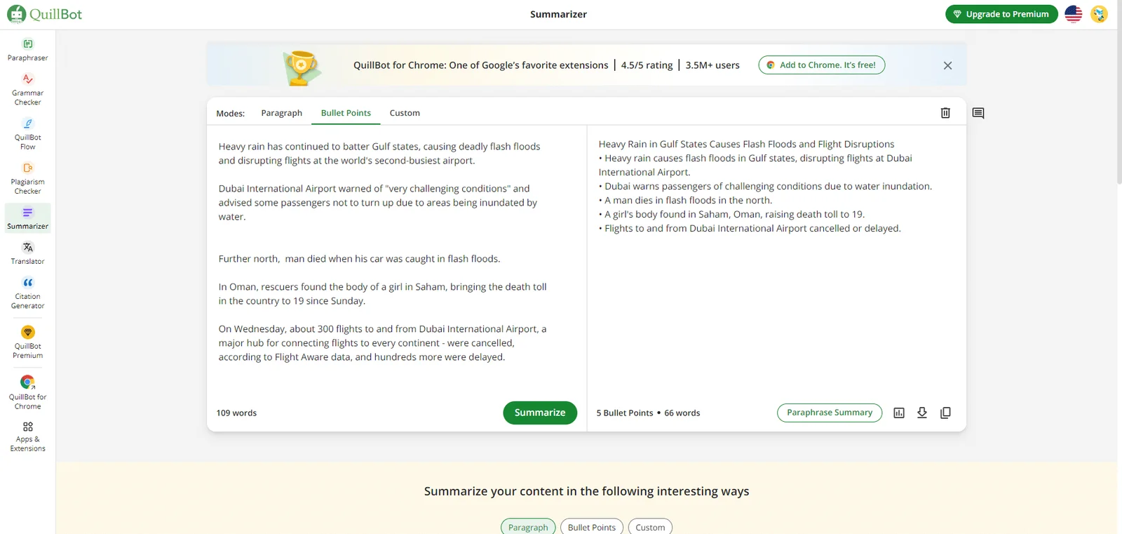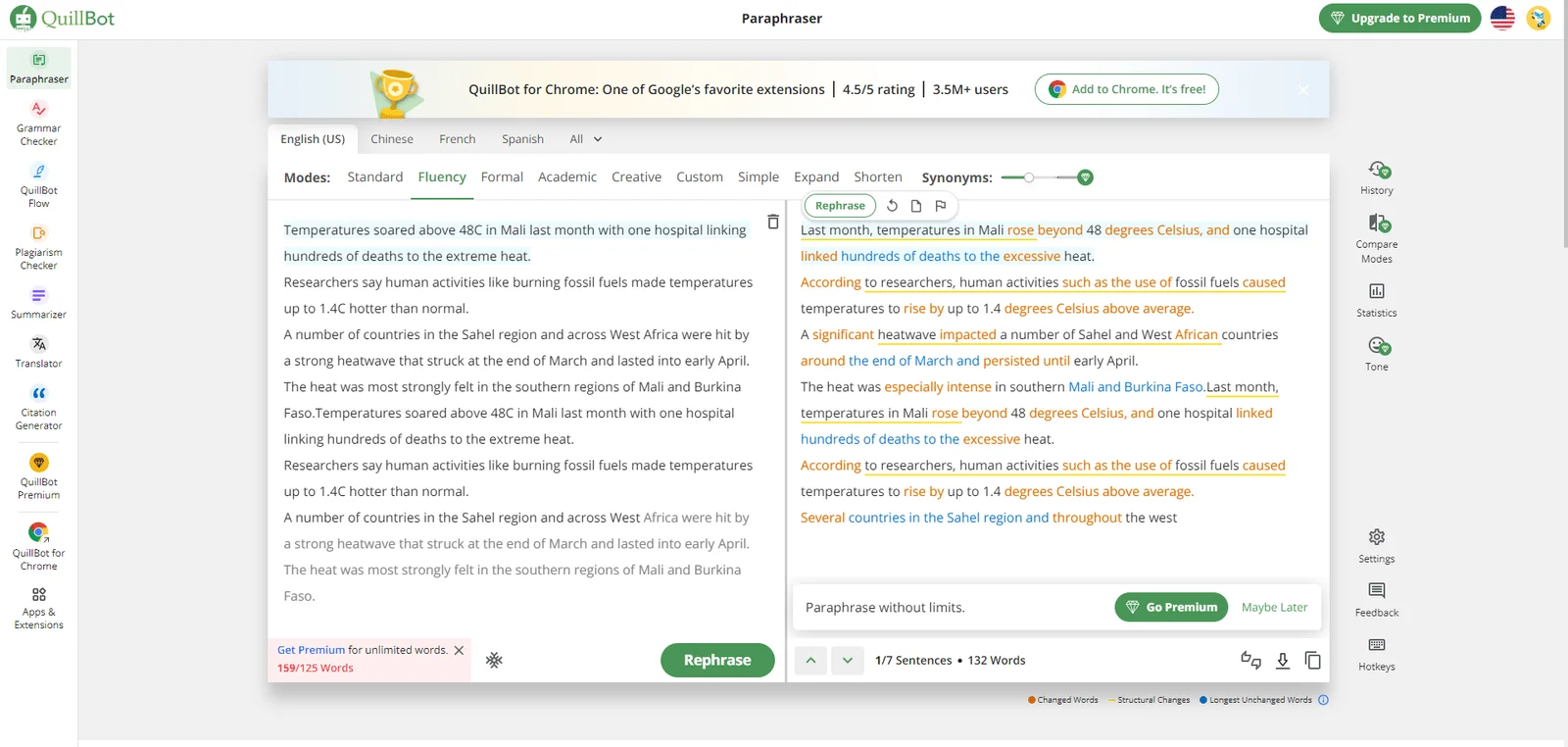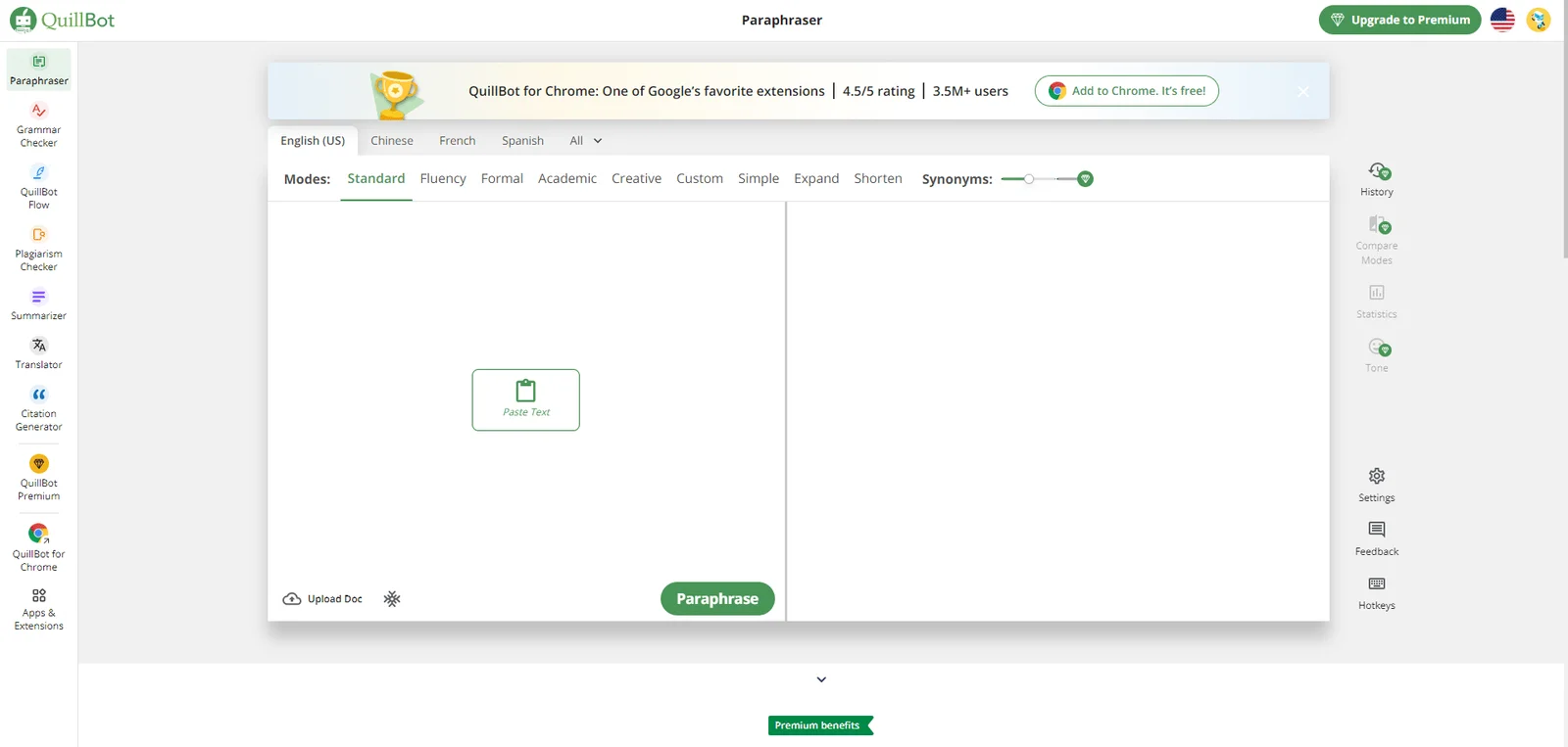 QuillBot の登録とログイン後のサポート無料トライアル, 無料アカウントでは、2 つのモードと 3 つの同義語設定を含むほとんどのツールへの基本的なアクセスが提供され、一度に最大 125 語の言い換え、1,200 語の要約、利用可能な拡張子の使用が可能です。