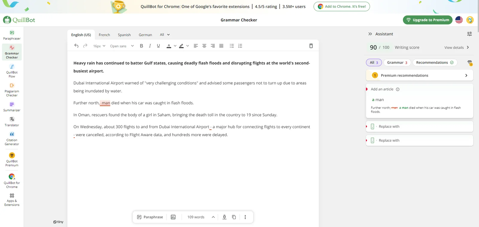 チェックする必要があるテキストを入力ボックスにコピーし、上で言語を選択すると、QullBot が自動的に文法をチェックします。チェック結果が右側に表示されます。詳細を表示するには、「詳細を表示」をクリックします。キーの変更には文法上の問題があり、ワンクリックで置き換えるための書き換えの提案も表示されます。右上隅の「アシスタント」の右側にある設定アイコンをクリックして、文章の設定を変更したり、詳細な提案を表示したりできます。このページでは、フォーマットの変更も提供します。変更が完了したら、以下からダウンロードまたはコピーするか、Paraphraser (書き換えジェネレーター) 機能にジャンプできます。
