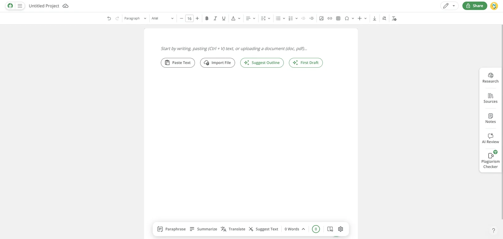 右側の列では、[リサーチ] を使用して QuillBot AI 検索を実行できます。これにより、従来の/学術的な回答を簡単に見つけたり、推奨される質問の関連付けを提供したりできます。 「出典」では、出典の検索と追加、引用の編集が可能です。 「ノート」は、重要な点や困った点、一時的なインスピレーションやアイデアなど、気軽に記録しておきたいことを自由にメモできる機能です。 「AI Review」は QuillBot から執筆アドバイスを求めることができます(50 ワードを超える内容)。 「剽窃チェッカー」は、剽窃をチェックするのに役立ちます。