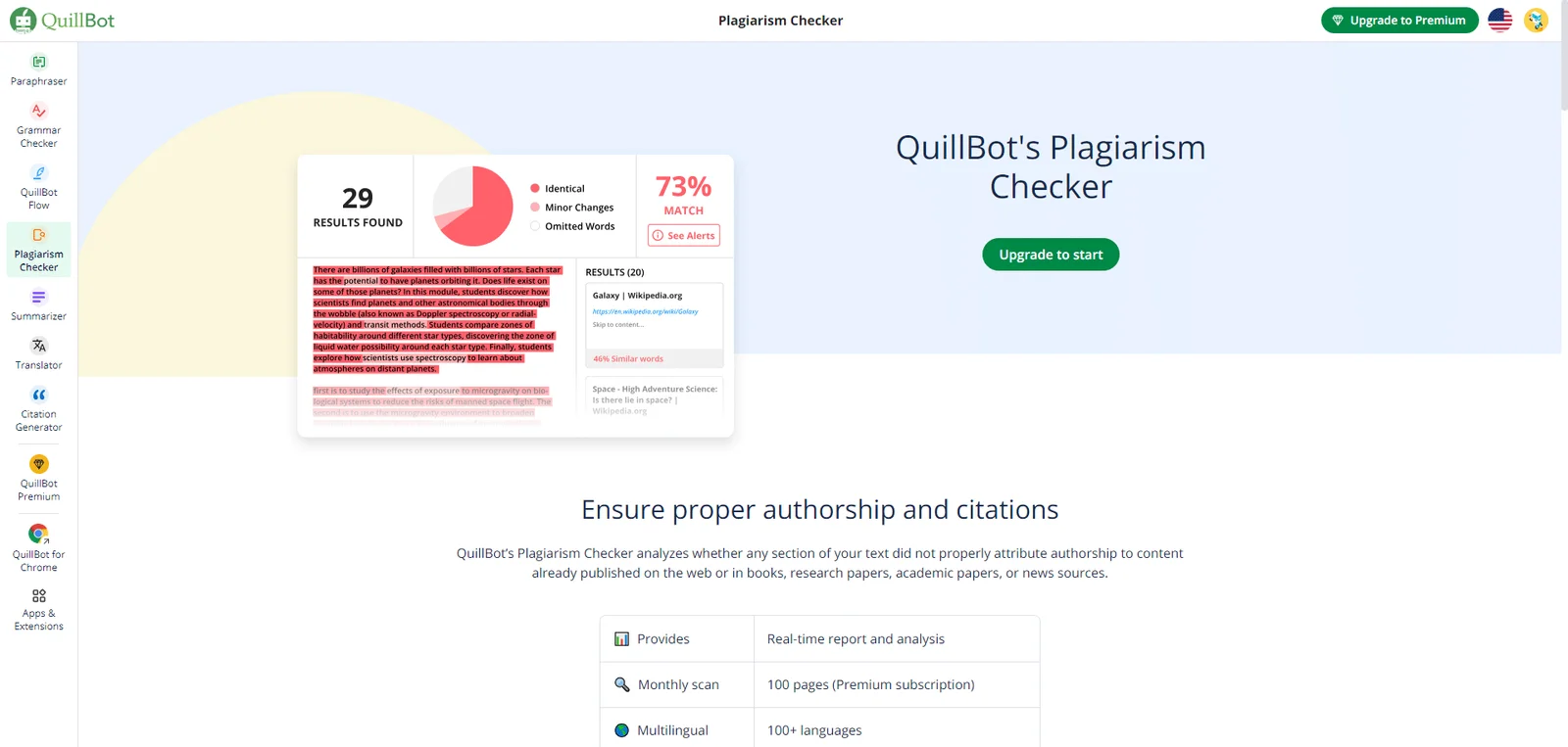 これはプレミアム機能であり、使用するにはメンバーシップが必要です。中国語を含む100以上の言語をサポートしており、論文の盗作チェックに適しています。
