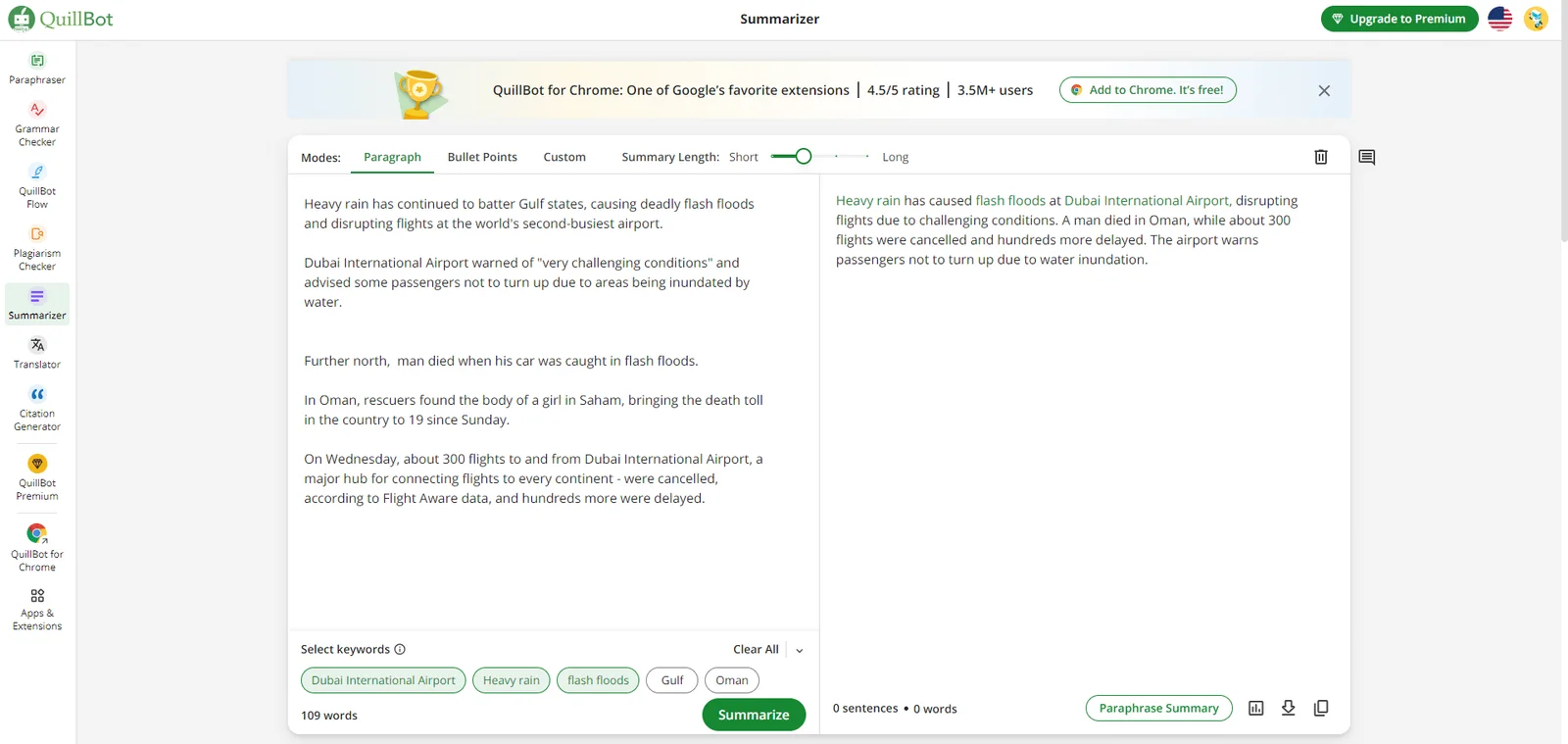要約する必要があるテキストを左側のテキスト ボックスに貼り付け、「段落」を選択して段落の要約を作成します。以下のキーワードを選択し、「要約」をクリックして要約を生成します。右下隅のアイコンをクリックして統計データを表示します。ダウンロードしてコピーします。