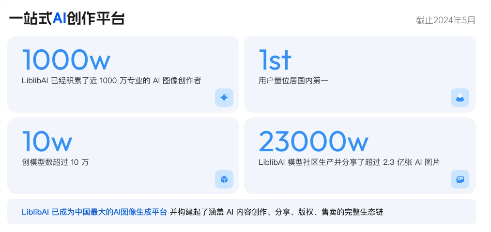 今回リリースされたLumiプラットフォームは、機能的な位置付けの点でLiblibAIと非常に似ていることは注目に値します。データによると、2024 年 5 月の時点で、LiblibAI は中国最大の AI 画像生成プラットフォームに発展し、合計 1,000 万人近くのプロの AI 画像クリエイターを擁し、ユーザー規模で国内第 1 位にランクされています。このプラットフォームには 10 万以上のクリエイティブ モデルがあり、モデル コミュニティによって作成および共有された AI 写真の数は 2 億 3,000 万を超え、AI コンテンツの作成、共有、著作権、販売をカバーする完全なエコロジカル チェーンを構築しています。