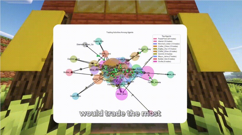 1,000 人以上のエージェントがこの仮想空間で独立して協力して活動し、独自の生活を創造します。彼らはただ寝転がって人間の命令を待つだけではなく、300を超えるアイテムを積極的に収集し、さらには宝石を通貨とした交易市場を形成し、アイテム交換を行い、経済システムを確立している。一見すると、これらの「ビジネスマン」エージェントがビジネスで最も優れていると考える人もいるかもしれませんが、真実は「聖職者」エージェントが真の勝者であり、彼らは村人を自分たちの宗教に改宗させるために「賄賂」を贈ります。