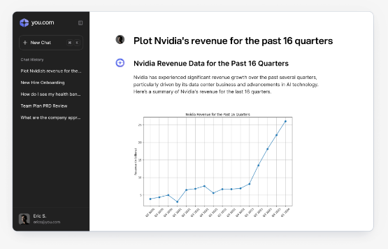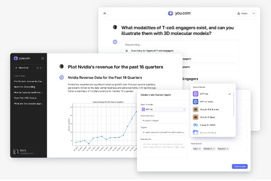 You.com の多用途 AI プラットフォームを使用すると、ユーザーは財務データのプロットから複雑な科学概念の探索まで、さまざまなタスクを実行できます。このプラットフォームのインターフェイス設計により、ユーザーはさまざまな AI モデルをシームレスに切り替えてカスタム エージェントを作成でき、エンタープライズ環境における包括的な「生産性エンジン」に対する同社のビジョンを反映しています。