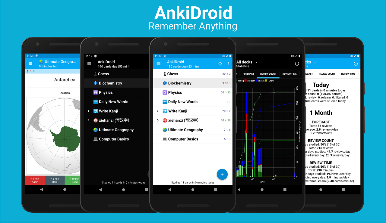오픈 소스 Anki의 반 공간 포트는 Android에 대한 반복 플래시 카드를 이격했습니다. ankidroid로 무엇이든 외우십시오!