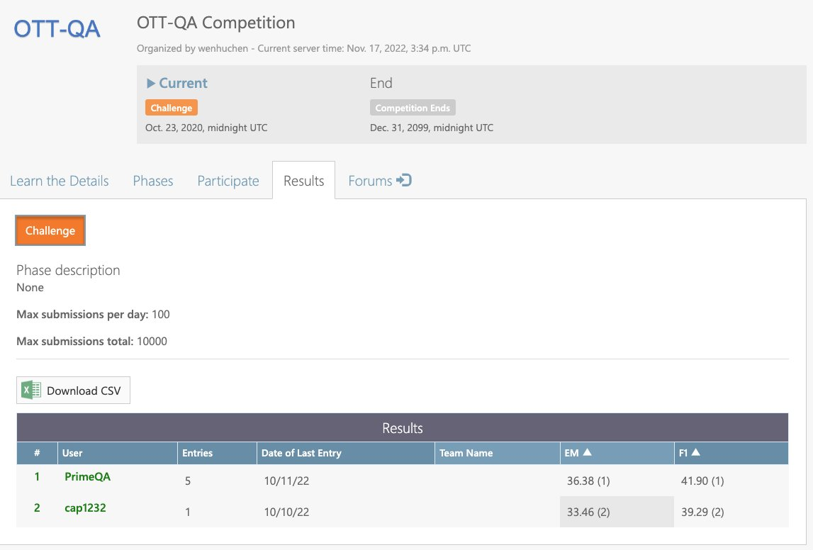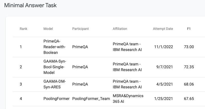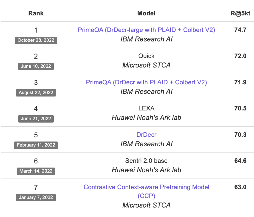Primeqa는 Xor-Tydi, Tydiqa-Main, Ott-QA 및 HybridQa의 여러 리더 보드의 최상위에 있습니다.