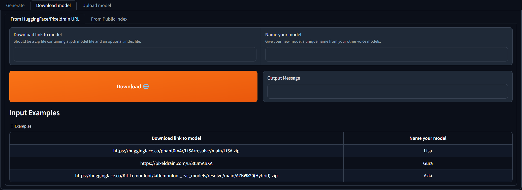 Download model 탭으로 이동하여 다운로드 링크를 RVC 모델에 붙여 넣고 고유 한 이름을 제공하십시오. 이미 훈련 된 음성 모델을 다운로드 할 수있는 AI 허브 불화를 검색 할 수 있습니다. 다운로드 링크가 어떻게 보이는지에 대한 예제를 참조 할 수 있습니다. 다운로드 된 zip 파일에는 .pth 모델 파일과 옵션. 인덱스 파일이 포함되어야합니다.