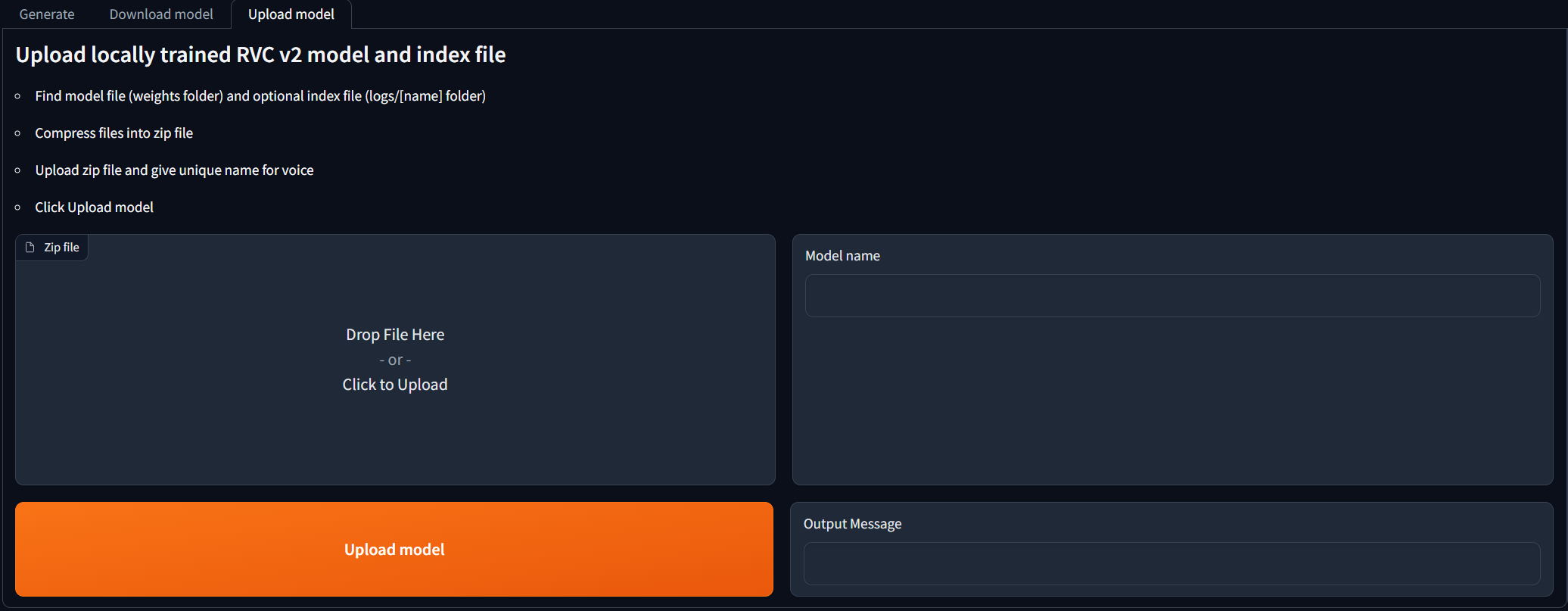 RVC V2 모델을 현지에서 교육하고 AI Cover Generation에 사용하려는 사람들을 위해. Upload model 탭으로 이동하여 지침을 따르십시오. 출력 메시지에 [NAME] Model successfully uploaded! 새로 고침 모델 버튼을 클릭 한 후 Generate 탭에서 사용할 수 있어야합니다!