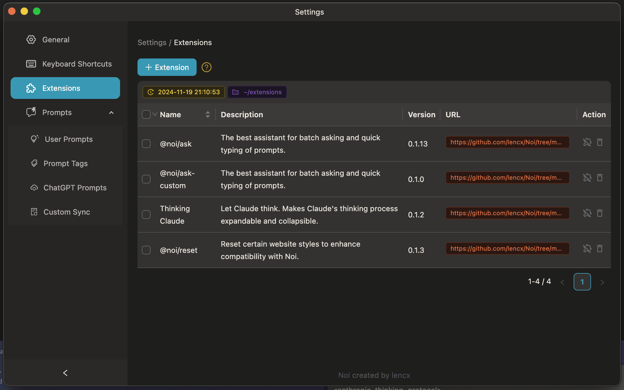 설정 에서이 옵션을 찾거나 메뉴를 통해 로컬 확장 디렉토리를 열 수 있습니다. HELP -> NOI userData-> Extensions .