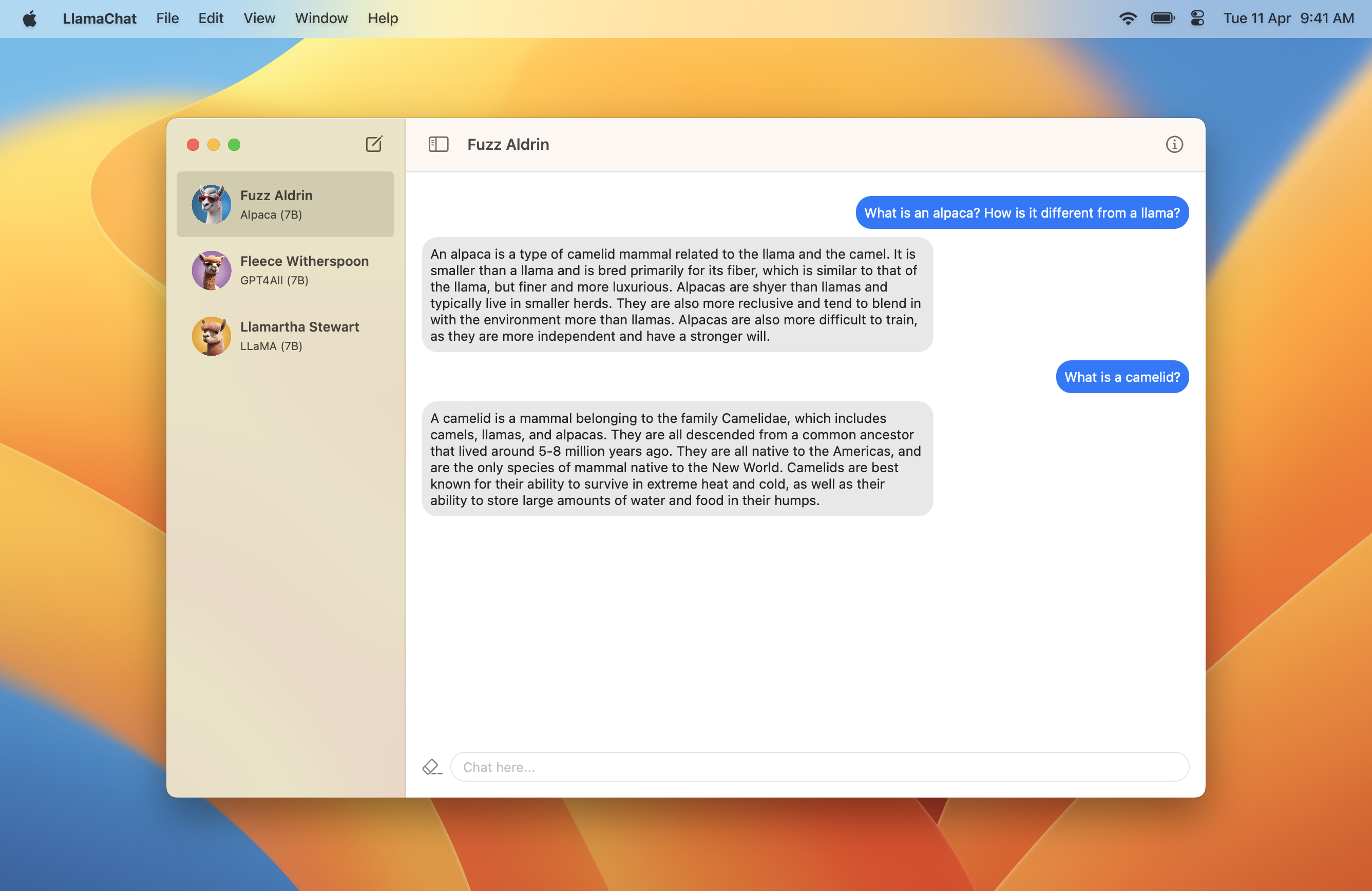 Llamachat 은 Mac에서 Llama, Alpaca 및 GPT4ALL 모델과 채팅 할 수있는 MACOS 앱입니다.