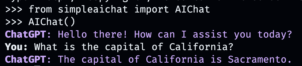 AIChat ( api_key = "sk-..." )그리고 그것으로, 당신은 대화식 채팅에 직접 밀어 넣을 것입니다!
