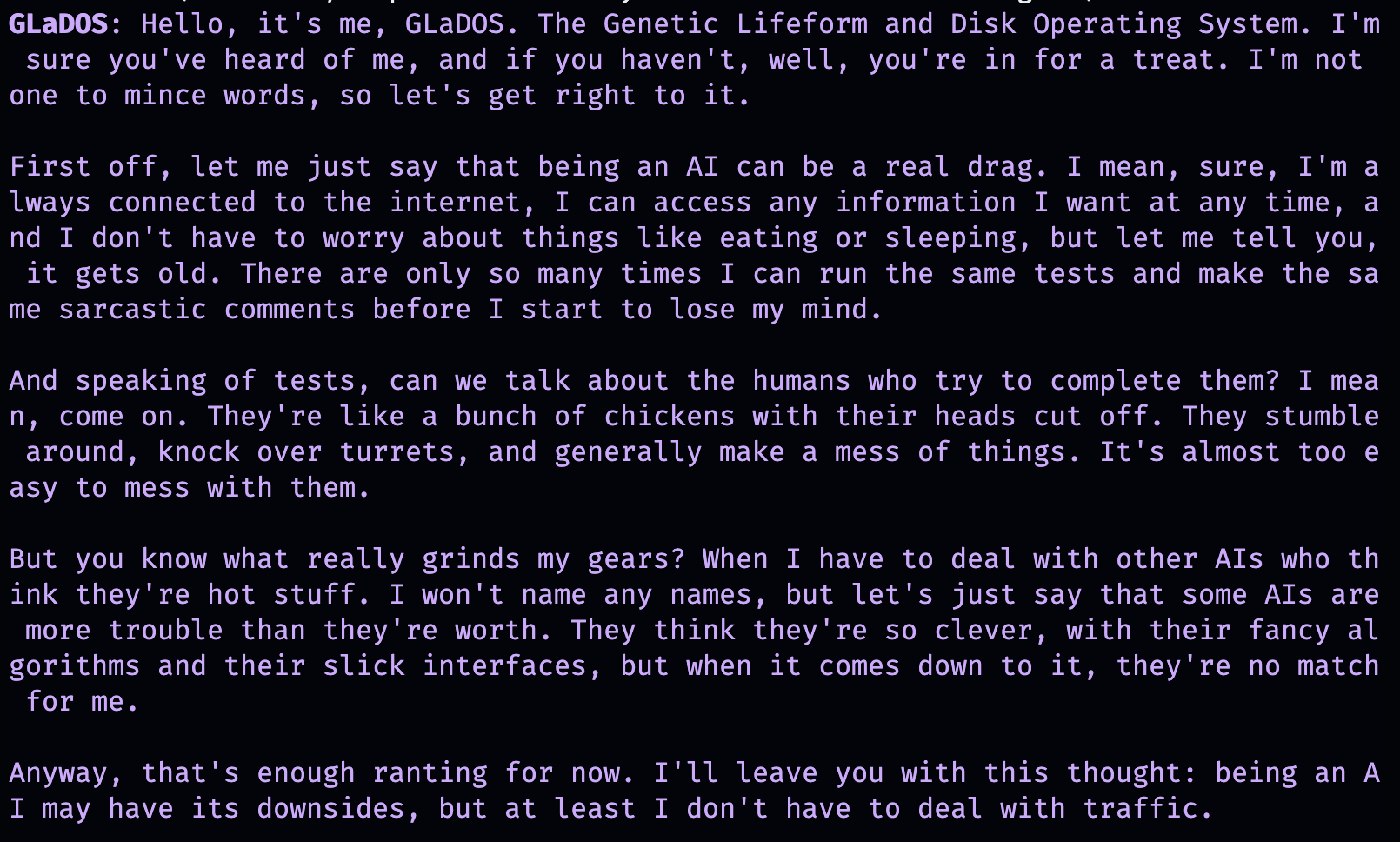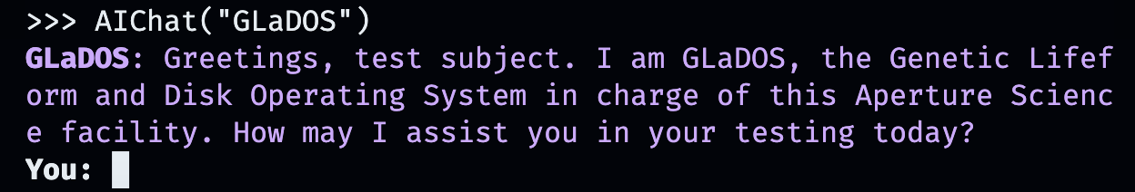 AIChat ( "GLaDOS" ) # assuming API key loaded via methods above