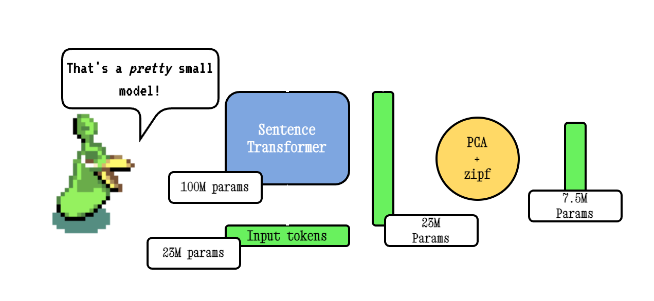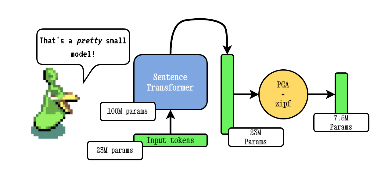 Base Model2VEC 기술은 문장 변압기 모델을 통해 어휘를 전달한 다음 PCA를 사용하여 결과 임베딩의 차원을 줄이고 마지막으로 ZIPF 가중치를 사용하여 임베딩을 가중시켜 작동합니다. 추론하는 동안, 우리는 단순히 문장에서 발생하는 모든 토큰 임베딩의 평균을 취합니다.