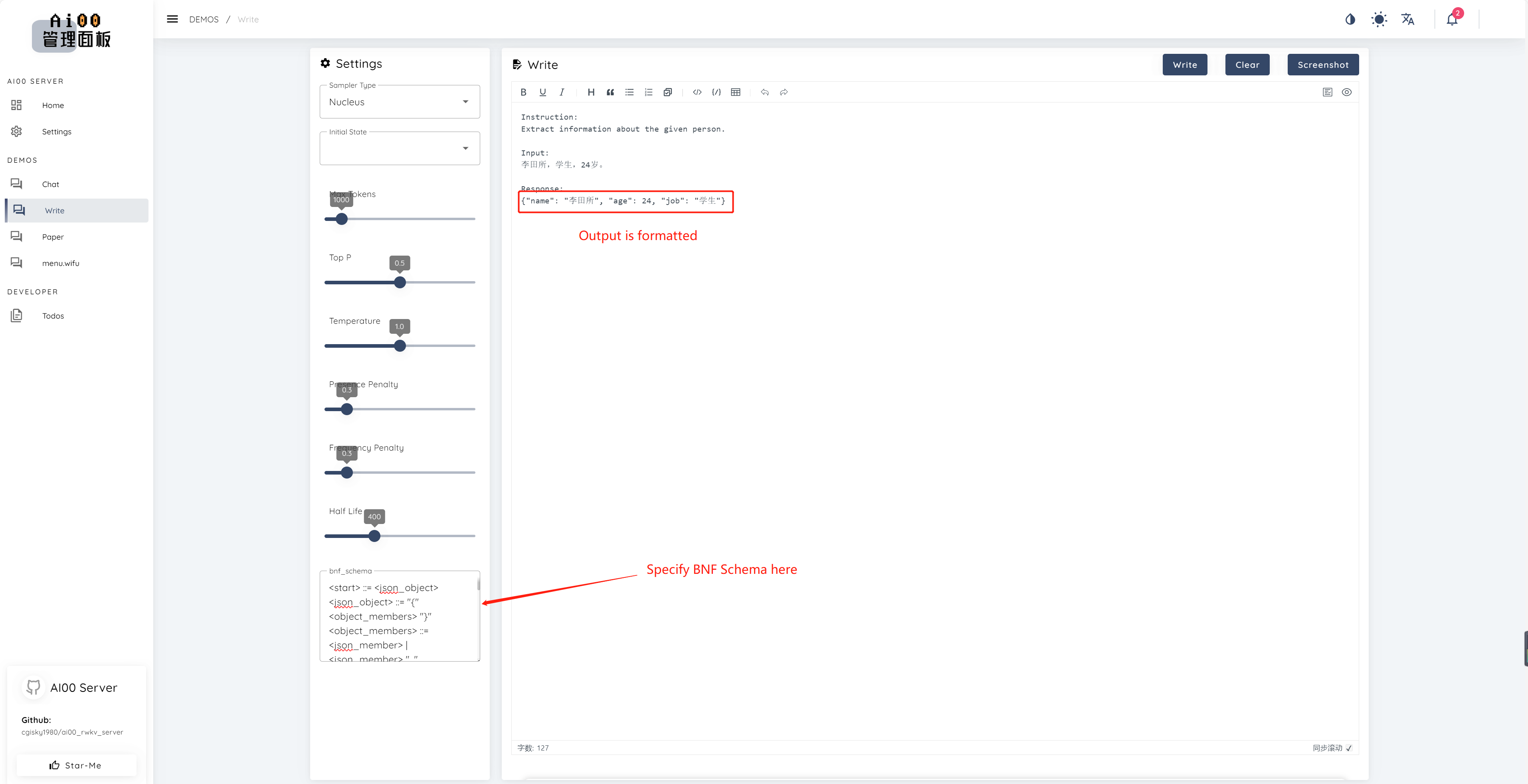 print ( ai00 . continuation ( "i like" ))V0.5 이후 AI00에는 BNF 샘플링이라는 고유 한 기능이 있습니다. BNF는 모델이 선택할 수있는 가능한 다음 토큰을 제한하여 지정된 형식 (예 : 지정된 필드와의 Markdown)으로 모델을 출력하도록 강요합니다.