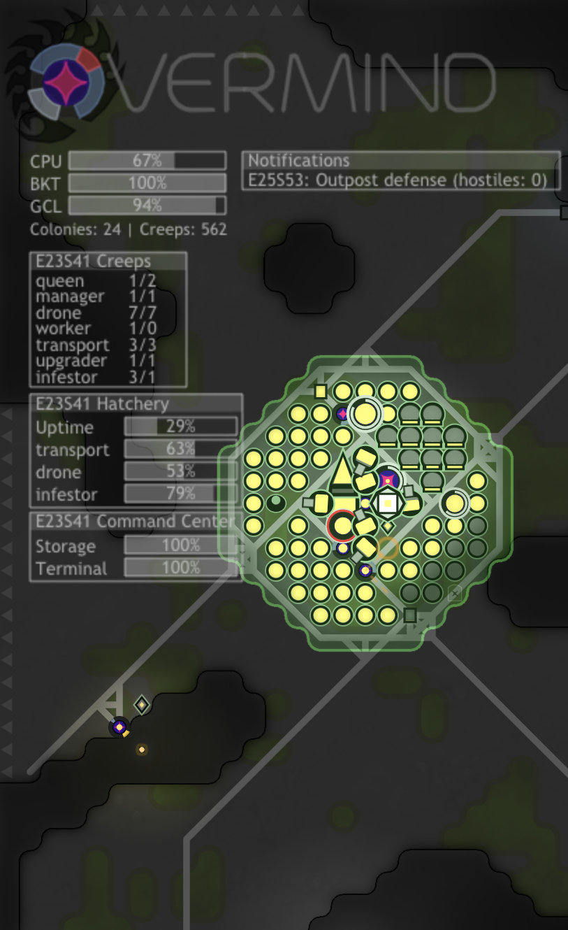 과잉은 공개 서버에서 실행되는 개인 코드베이스입니다. AI의 구조는 Starcraft의 Zerg의 떼 지능 주위에 느슨하게 테마입니다. 대 군주는 각 식민지 내에서 크리프 행동을 조정하고 식민지 감독관은 자극에 적응하도록 지시를합니다. 마지막으로, Assimilator를 통해 과거를 수행하는 모든 플레이어는 집단적 Hivemind 역할을 수행하여 크리프와 리소스를 공유하고 모든 플레이어가 공유하는 모든 지침의 마스터 원장에 공동으로 응답 할 수 있습니다.