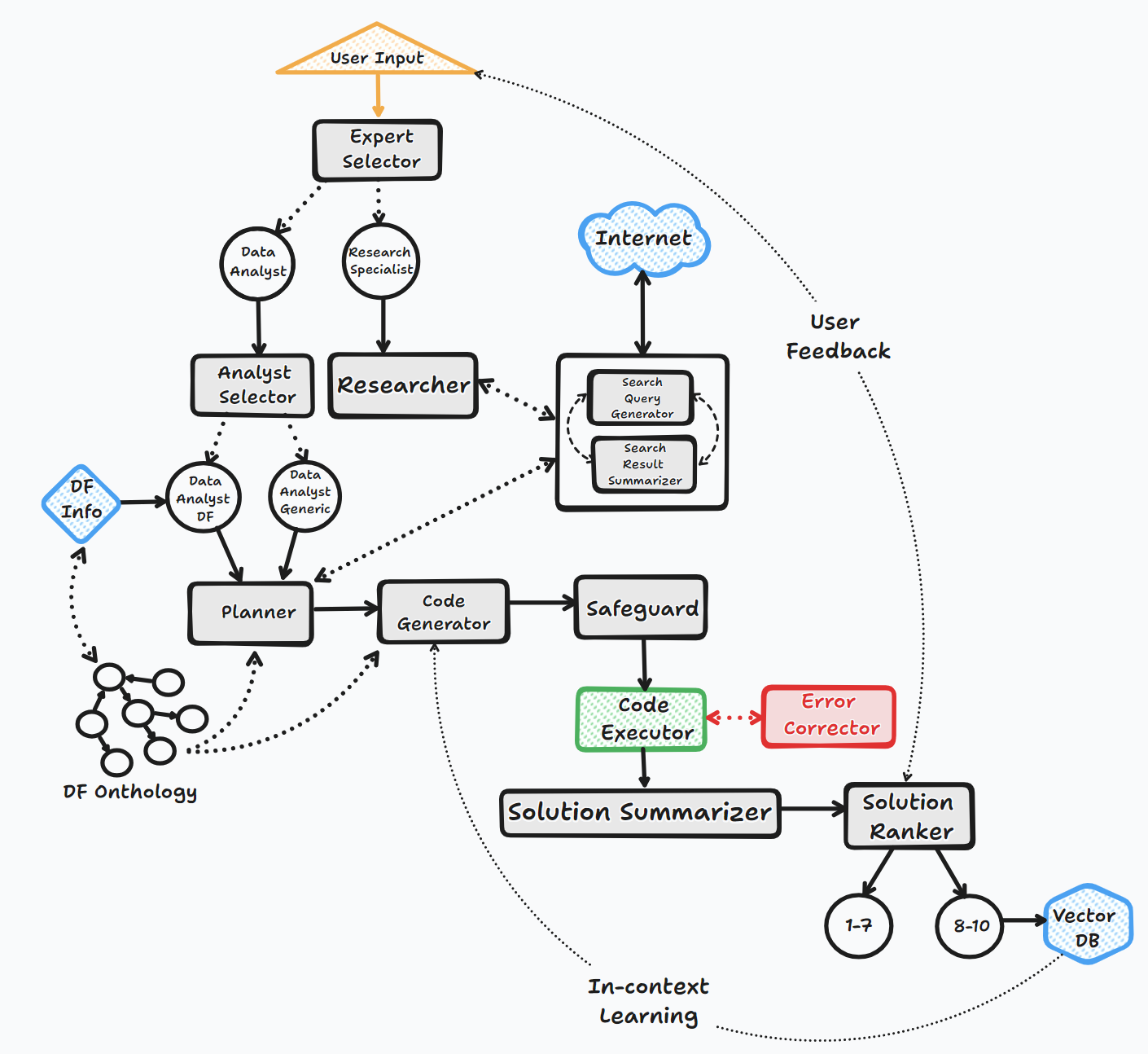이 프로세스를 통해 에이전트는 사용자 입력을 지속적으로 요청하고 컨텍스트를 위해 메시지를 저장하고 코드를 생성하고 실행하여 최적의 결과를 보장합니다. 이 프로세스에는 다양한 AI 모델과 벡터 데이터베이스가 사용되어 사용자의 질문에 대한 정확하고 유용한 응답을 제공합니다.