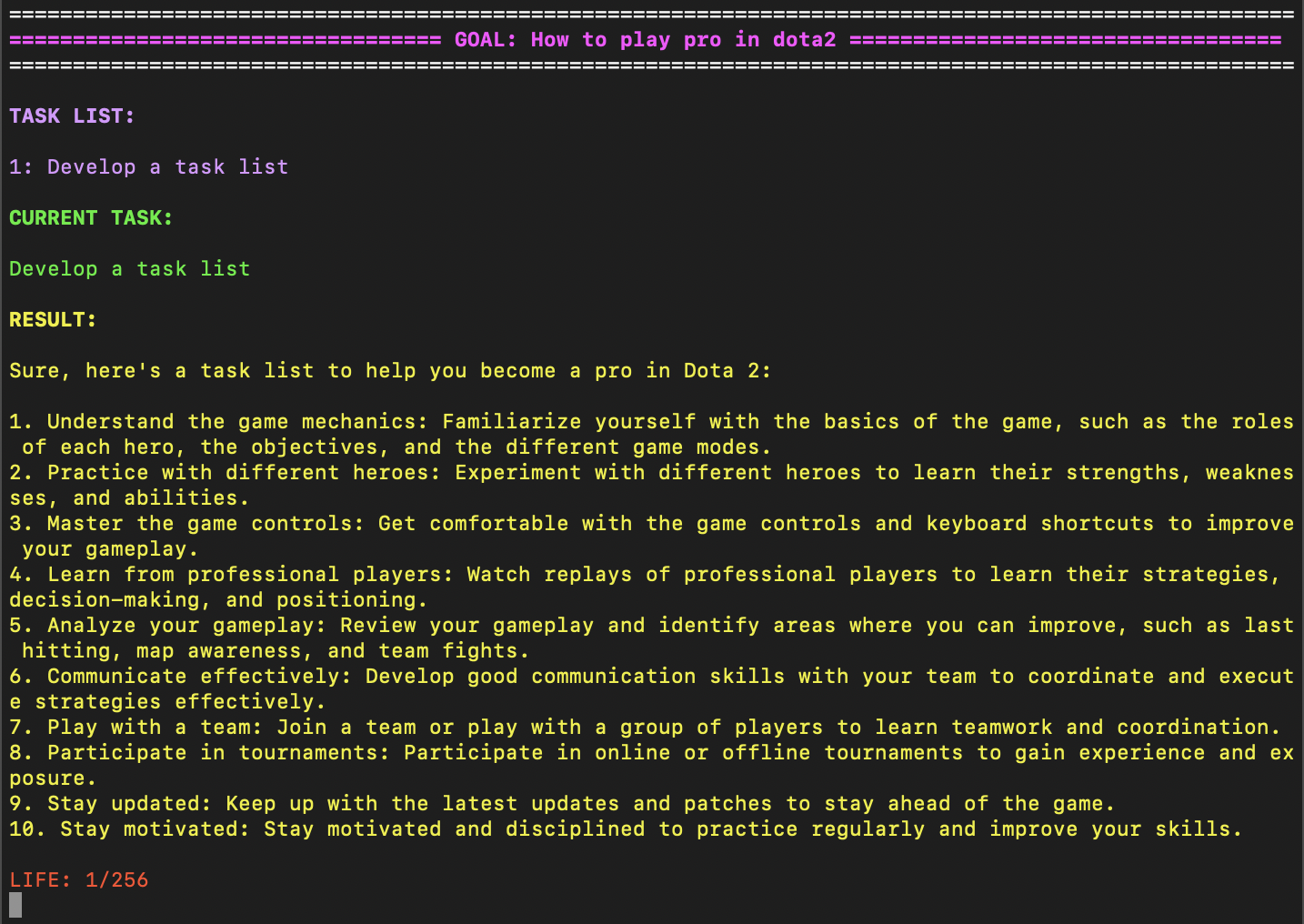 cd setupsetup 폴더에는 chatgpt를 Momery Store로 사용하는 game.yaml 의 두 가지 게임 설정이 있으며 Pinecone을 Momery Store로 사용하는 game2.yaml 있습니다. API를 설정하려면 그 중 하나를 선택할 수 있습니다.game.yaml 파일에서 GPT를 메모리 저장소로 사용하므로 다음 정보를 작성하십시오.openai_api_key : OpenAI API 키. 하나가없는 경우 무료 계정을 만들고 OpenAI 웹 사이트에서 API 키를 얻을 수 있습니다.openai_model : OpenAI ChatGpt 모델을 사용할 수 있습니다. "gpt-3.5-turbo", "gpt4"또는 "text-davinci-003"중에서 선택하십시오.env_openai_api_key : OpenAi chatGpt env의 경우 공통점과 동일하게 유지할 수 있습니다.agent_openai_api_key : Openai chatgpt 에이전트를위한 키, 공통과 동일하게 유지할 수 있습니다.goal : AI 에이전트의 주요 목표.init_task : 작업 목록에 추가 될 초기 작업.agent_life : 에이전트의 수명 시간, 기본적으로 256으로 설정했습니다. 참고 : 선택적으로 Pinecone을 메모리 저장소로 사용하는 game2.yaml 사용할 수 있습니다. 위의 설정 외에도 다음 정보를 작성해야합니다.
