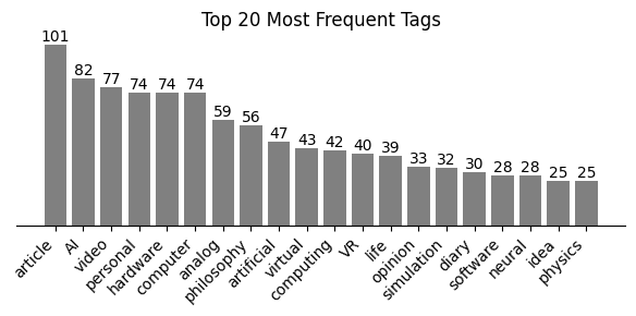 보관소의 통계를 몇 개, 단어 수, 태그 수, 태그 등과 같은 통계를 인쇄하십시오. 이 스크립트는 또한 Github와 같은 활동 타임 라인과 가장 인기있는 태그의 바 차트를 만듭니다.