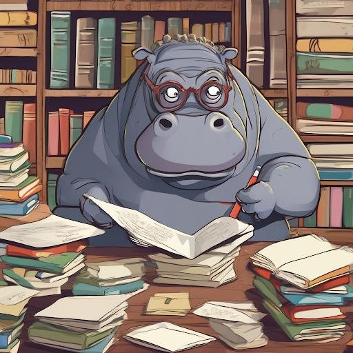 "prompts": ["hippo with glasses in a library, cartoon styling"],