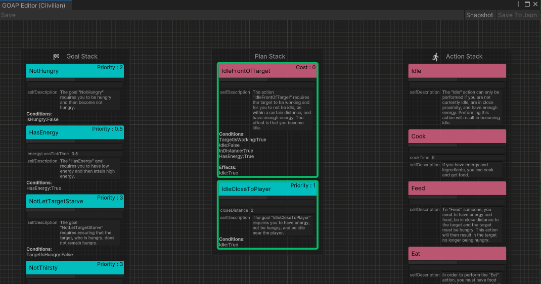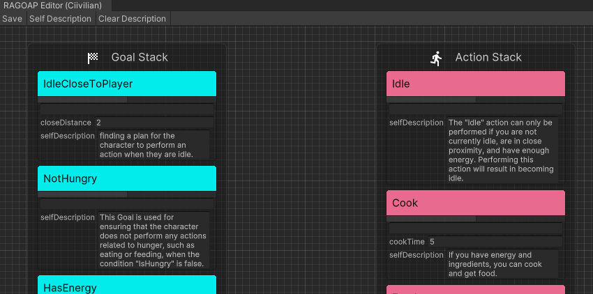 각 행동은 GOAP 규칙을 기반으로하며 전제 조건 Precondition 과 효과 Effect 가 있습니다.