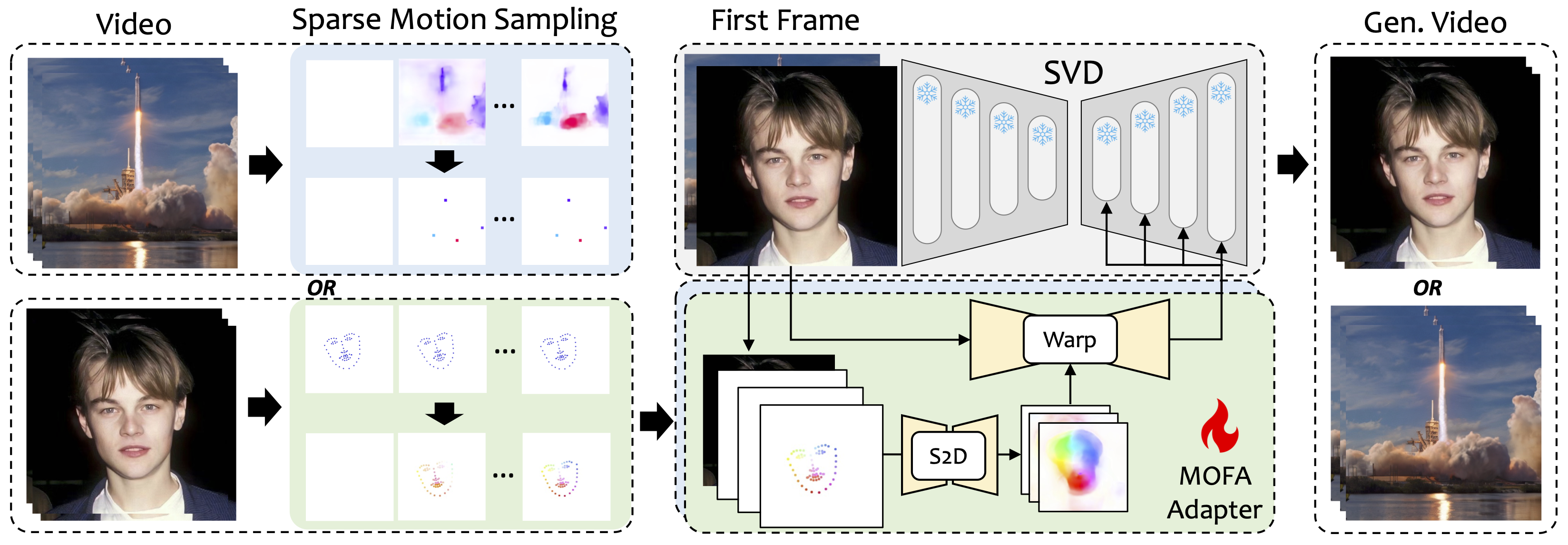 훈련 단계에서 드문 모션 샘플링을 통해 드문 제어 신호를 생성 한 다음 다른 MOFA 자산을 훈련하여 미리 훈련 된 SVD를 통해 비디오를 생성합니다. 추론 단계 동안, 상이한 MOFA 자산을 결합하여 동결 된 SVD를 공동 제어 할 수있다.