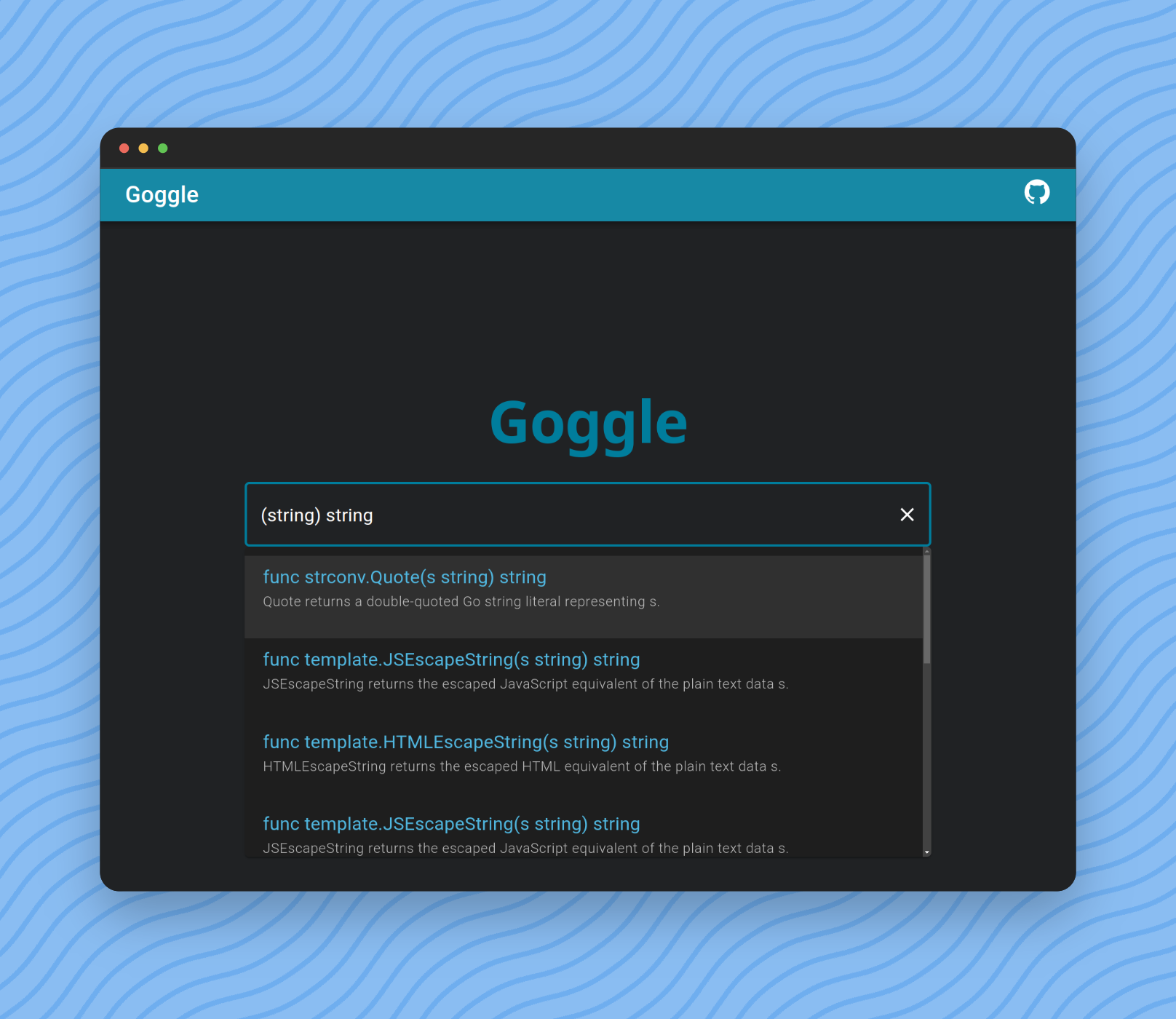 Query = [ " func " ] [ identifier ] Parameters [ Type ] .$ git clone https://github.com/abiriadev/goggle && cd goggle$ go run ./cmd/indexer