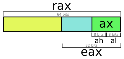 EAX , EBX , ECX 및 EDX 레지스터의 경우 하위 섹션이 사용될 수 있습니다. 예를 들어, 가장 유의미한 2 바이트의 EAX 는 AX 라는 16 비트 레지스터로 취급 될 수 있습니다. AX 의 가장 중요한 바이트는 AL 이라는 단일 8 비트 레지스터로 사용될 수있는 반면, AX 의 가장 중요한 바이트는 AH 라는 단일 8 비트 레지스터로 사용할 수 있습니다. 이 이름은 동일한 물리적 레지스터를 나타냅니다. 2 바이트 수량이 DX 에 배치되면 업데이트는 DH , DL 및 EDX 의 값에 영향을 미칩니다. 이 하위 등록은 주로 16 비트 버전의 명령어 세트에서 보류됩니다. 그러나 32 비트보다 작은 데이터 (예 : 1 바이트 ASCII 문자) 를 다룰 때 때때로 편리합니다.