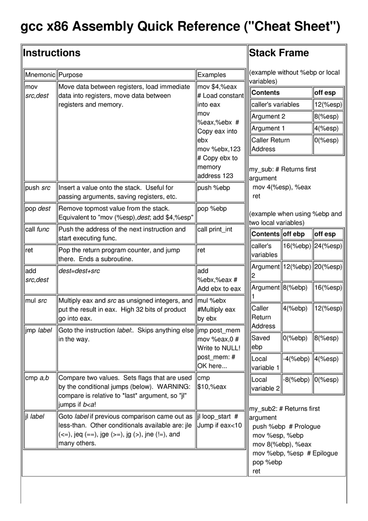 전체 치트 시트 X86 어셈블리, 20 페이지.