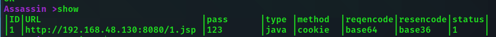 add http://192.168.48.130:8080/1.jsp 123 java method=cookie resEncode=base36