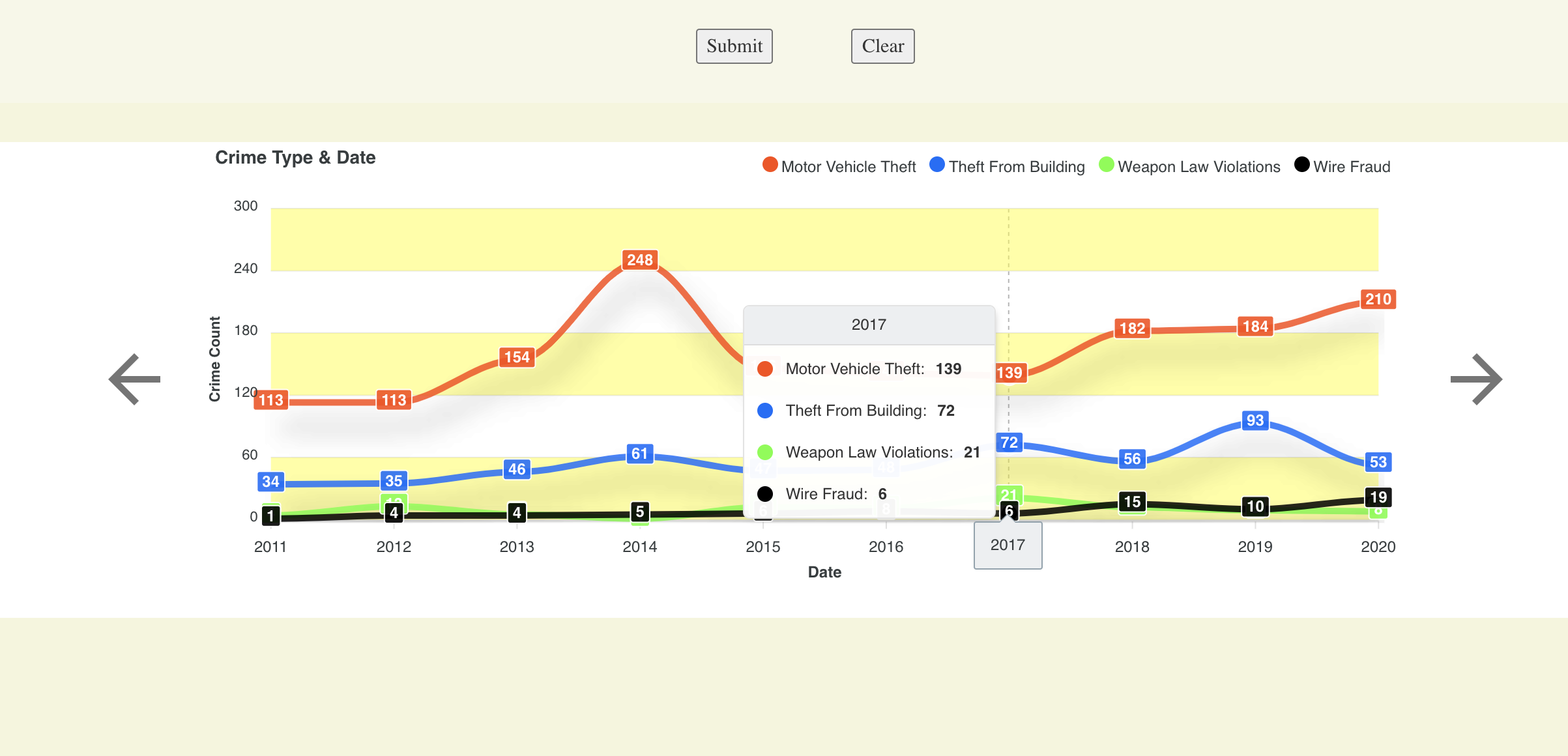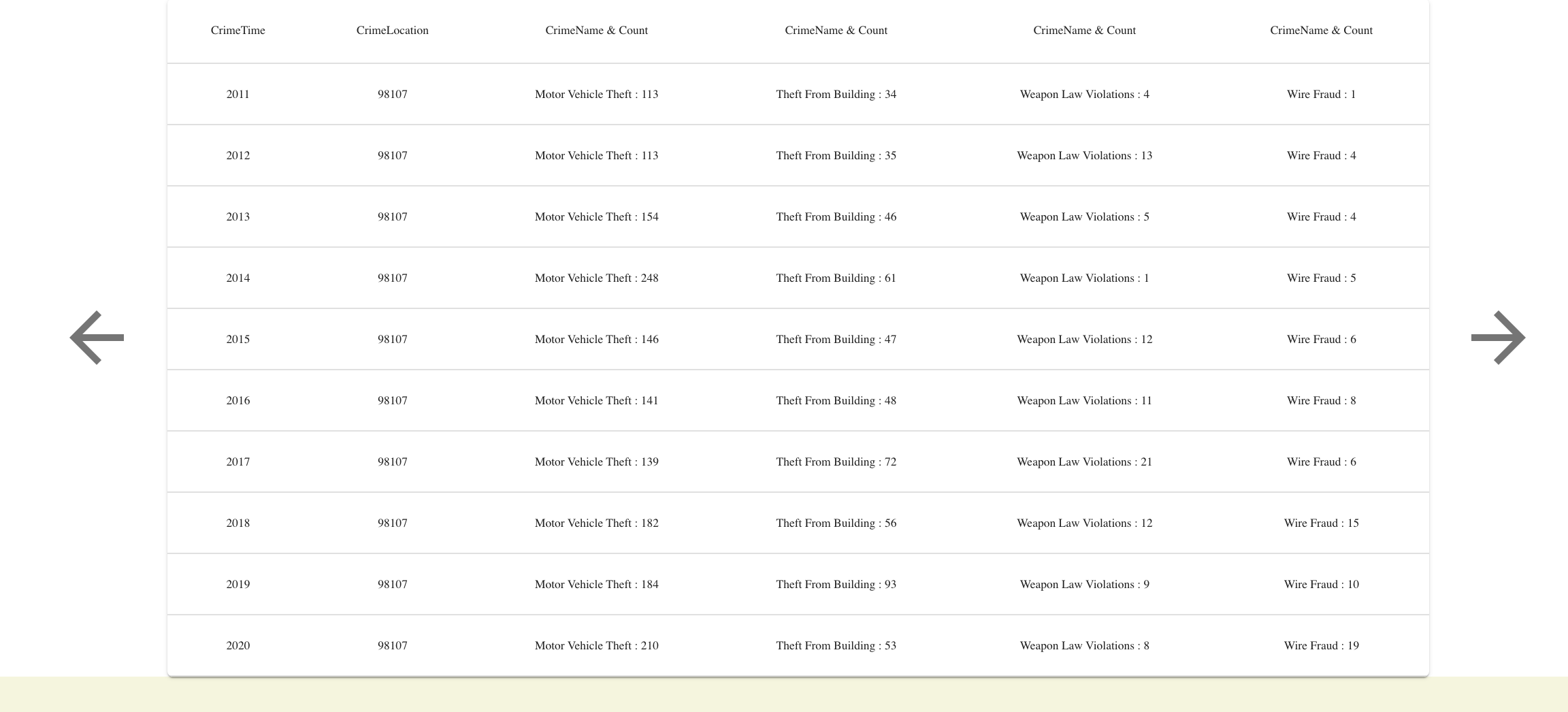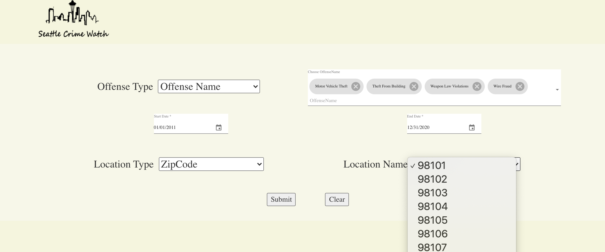 응용 프로그램을 통해 사용자는 시애틀에서 업데이트 된 범죄 정보를 찾을 수 있습니다. 사용자는 범주, 그룹 또는 상세한 범죄 이름에 따라 범죄를 검색 할 수 있습니다. 또한 사용자는 검색 작업의 기간 (2011-2020) 및 위치 유형 (Zipcode & MCPP)을 선택할 수 있습니다. 주요 특징은 사용자가 원하는만큼의 범죄를 선택하여 비교할 수 있다는 것입니다.