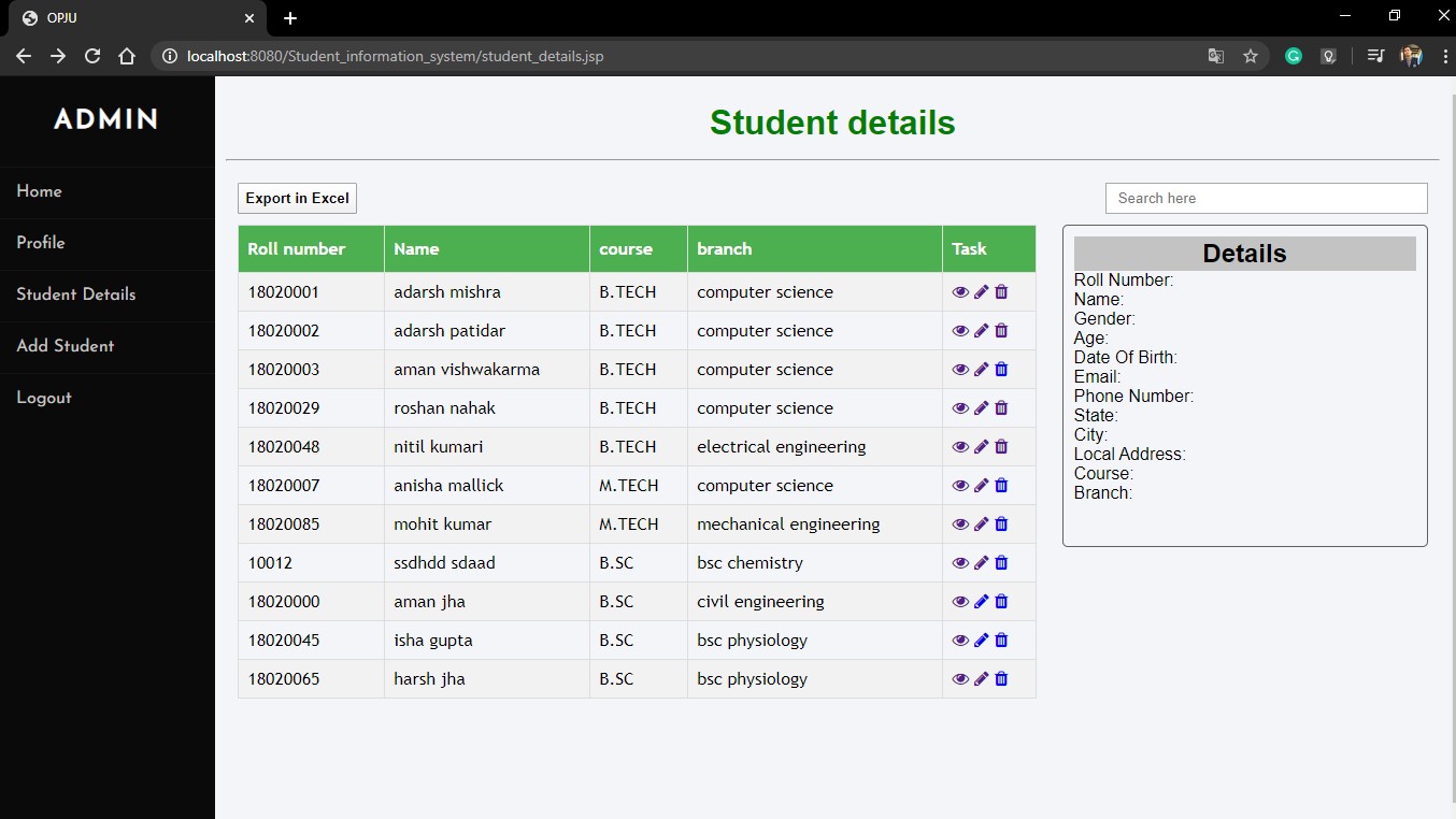 - Excel 내보내기 : 관리자는 모든 학생 세부 정보 (데이터베이스에서) Excel 시트로 내보낼 수 있습니다.