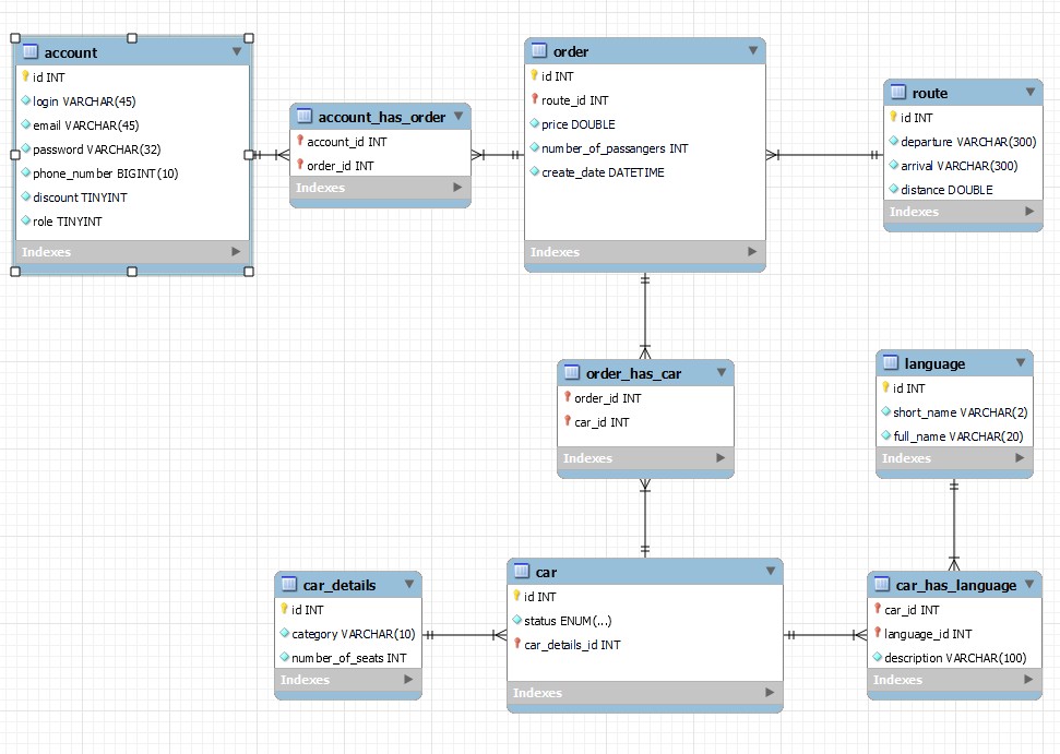 택시 서비스에는 운전자가 있습니다. 자동차는 용량의 특성과 카테고리의 특성을 가지고 있으며, TO_ORDER , IN_RUN 또는 비활성 (운전자가없는 함대에 위치)을 사용할 수 있습니다.