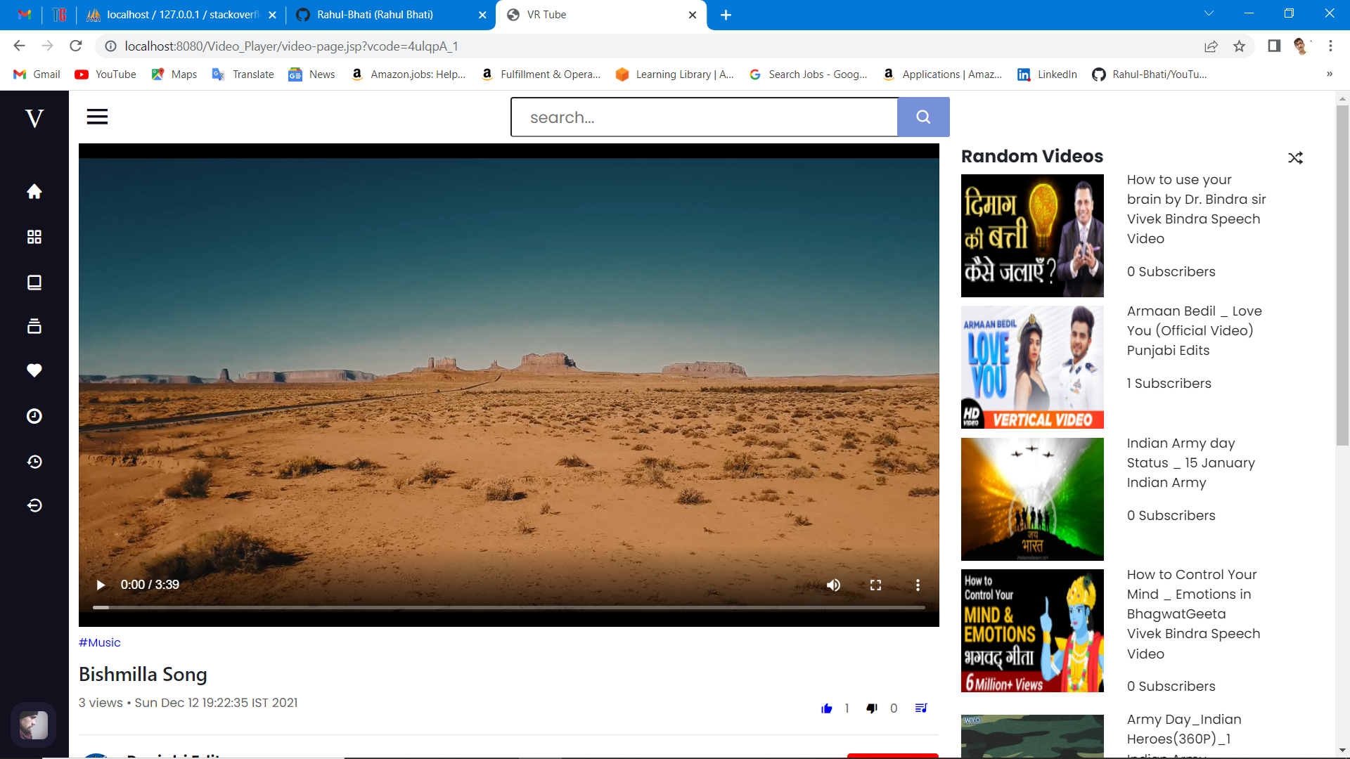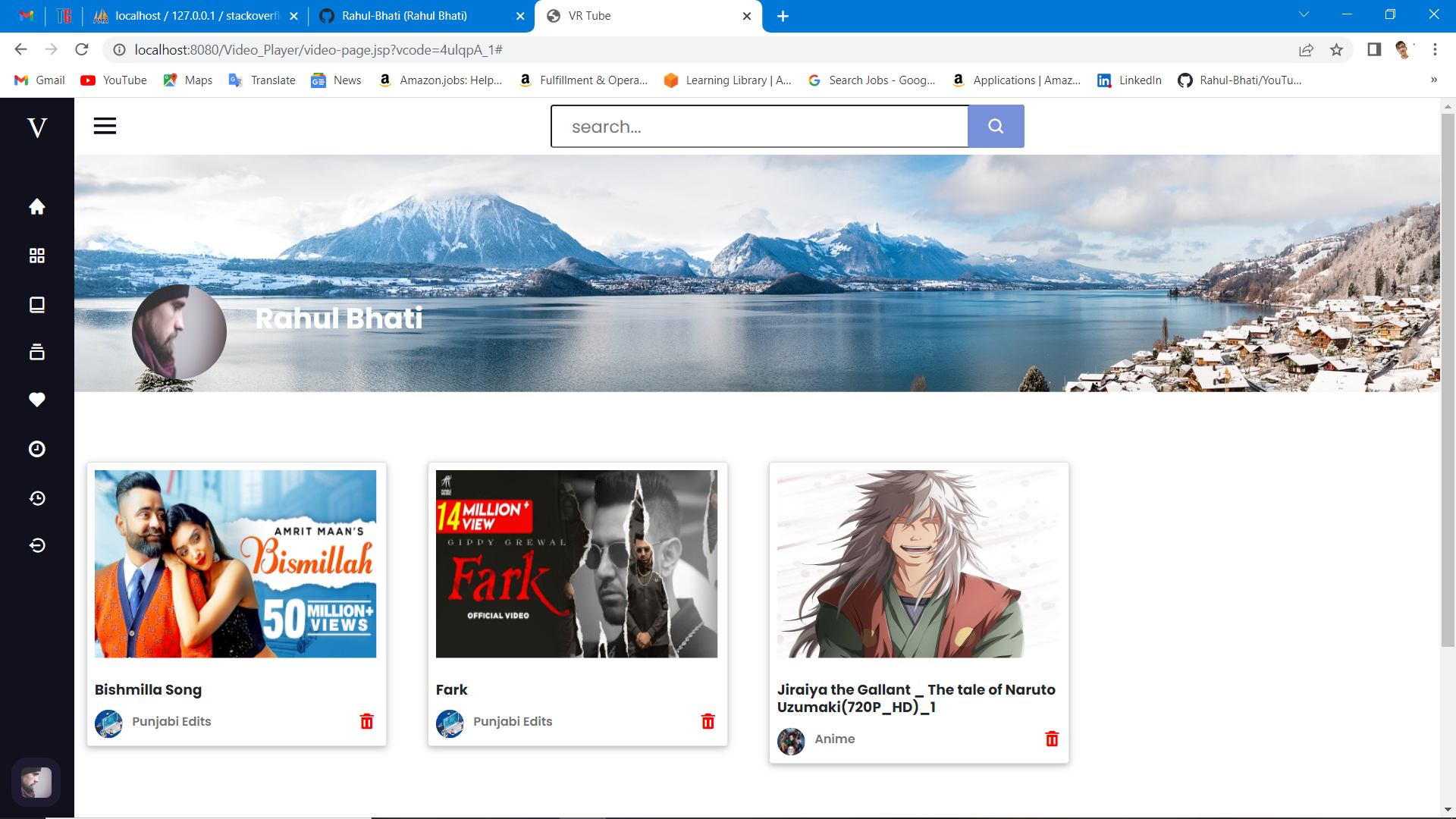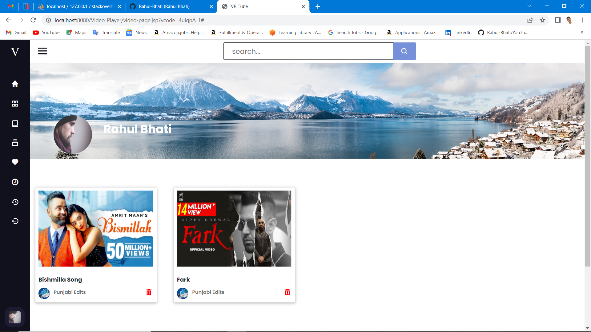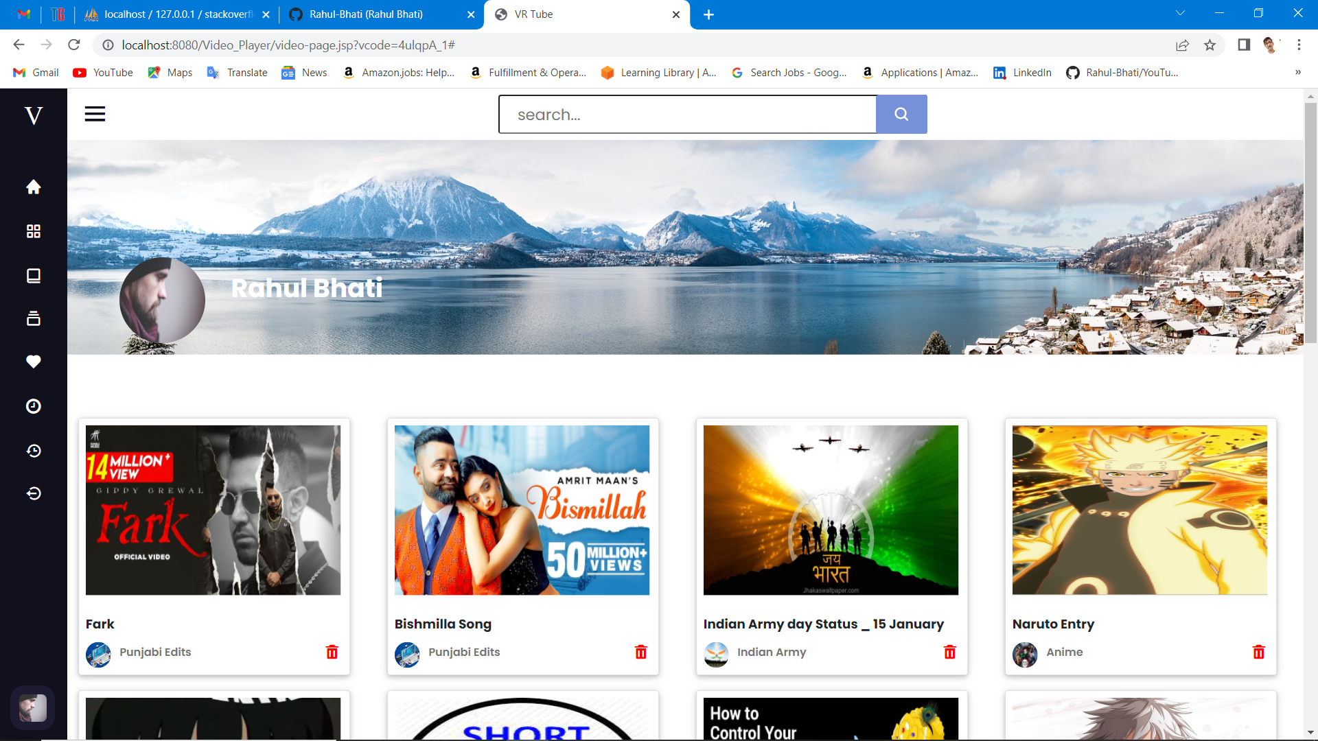 이 프로젝트에서는 비디오를보고 채널을 만들 수 있습니다. 비디오를 업로드 할 수 있습니다. 싫어하고 다른 채널을 구독하는 것을 좋아할 수도 있습니다. JSP를 사용하여 YouTube와 같은 사이트를 사용합니다. 또한이 프로젝트에서 HTML, CSS, JQuery, JavaScript, 부트 스트랩을 사용합니다.