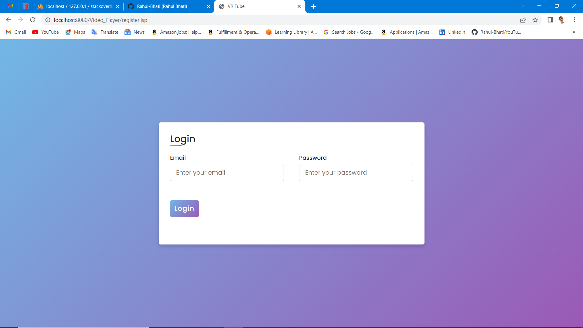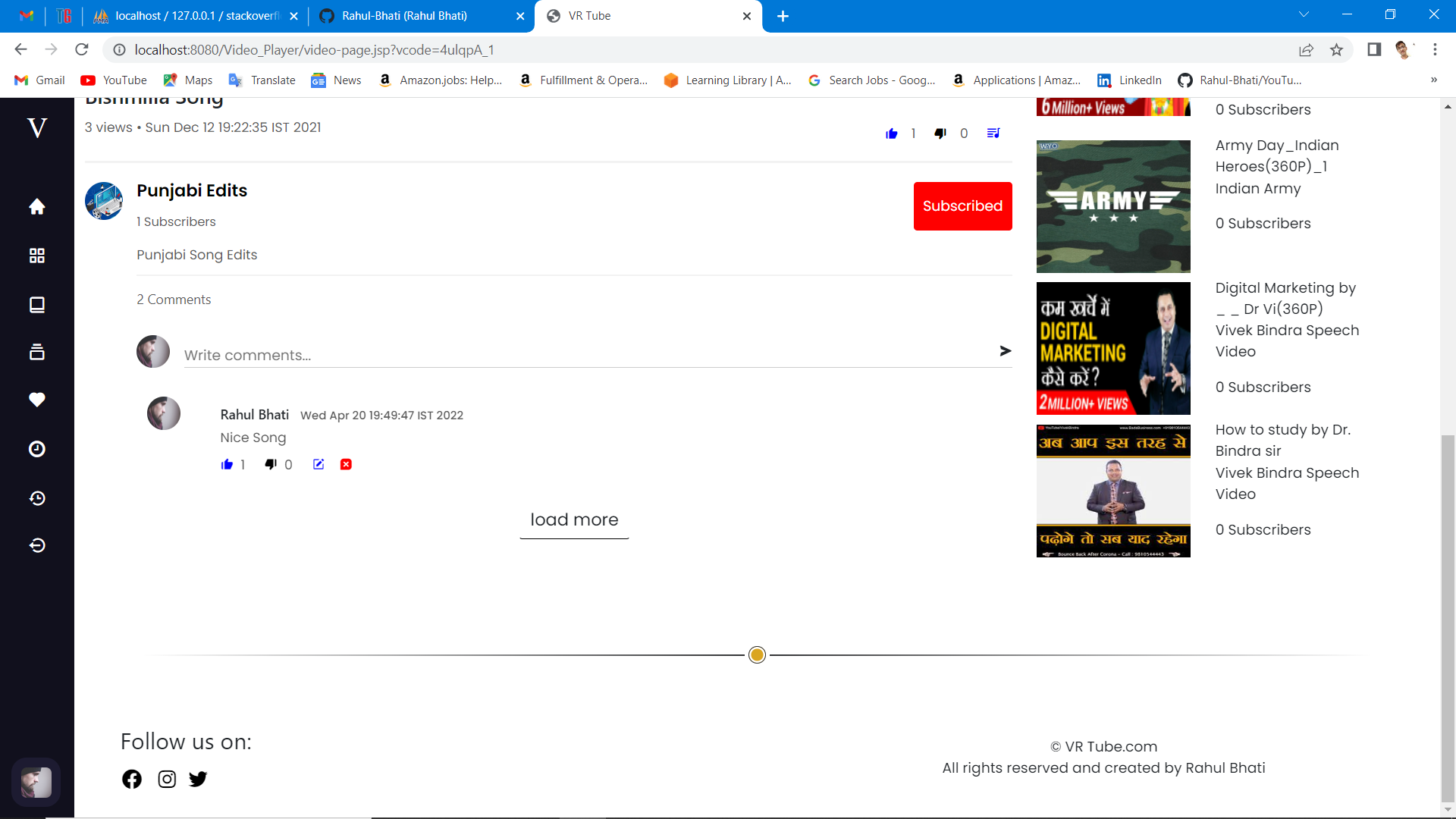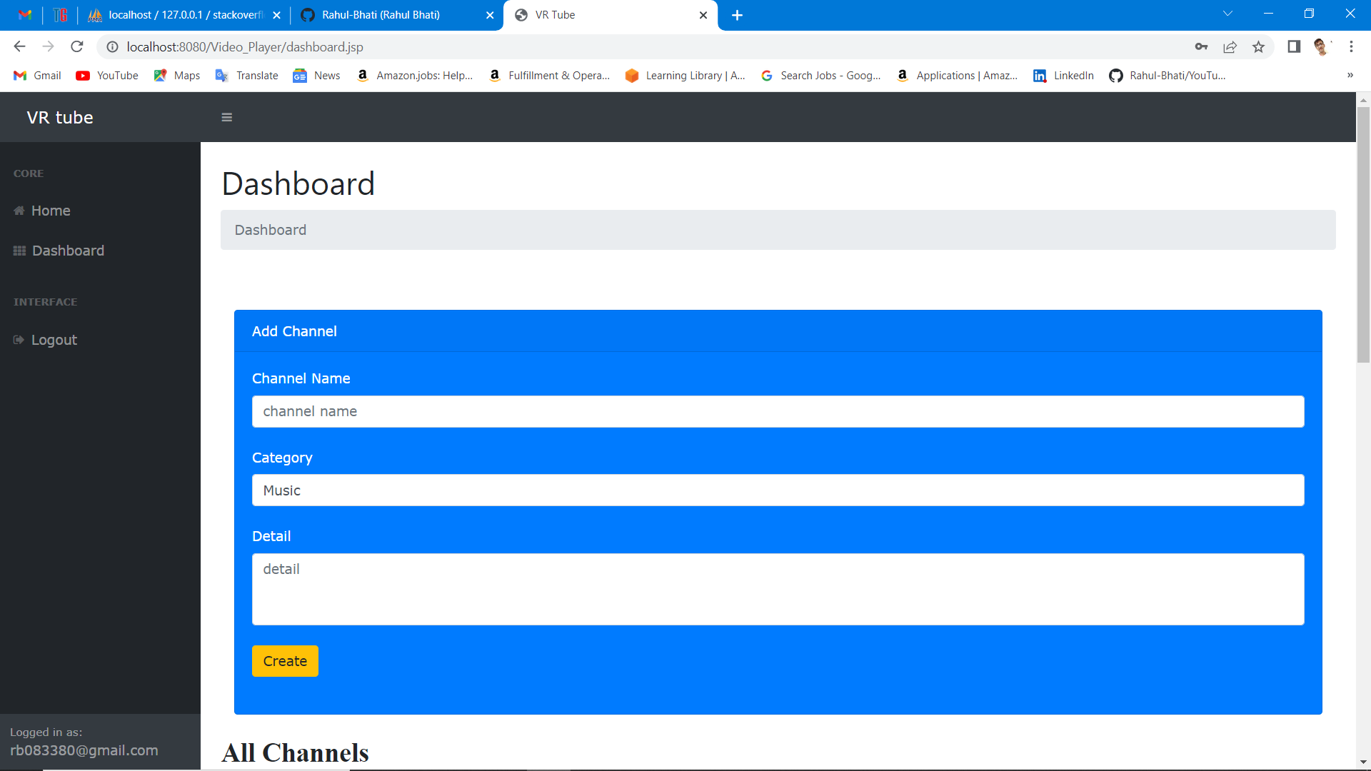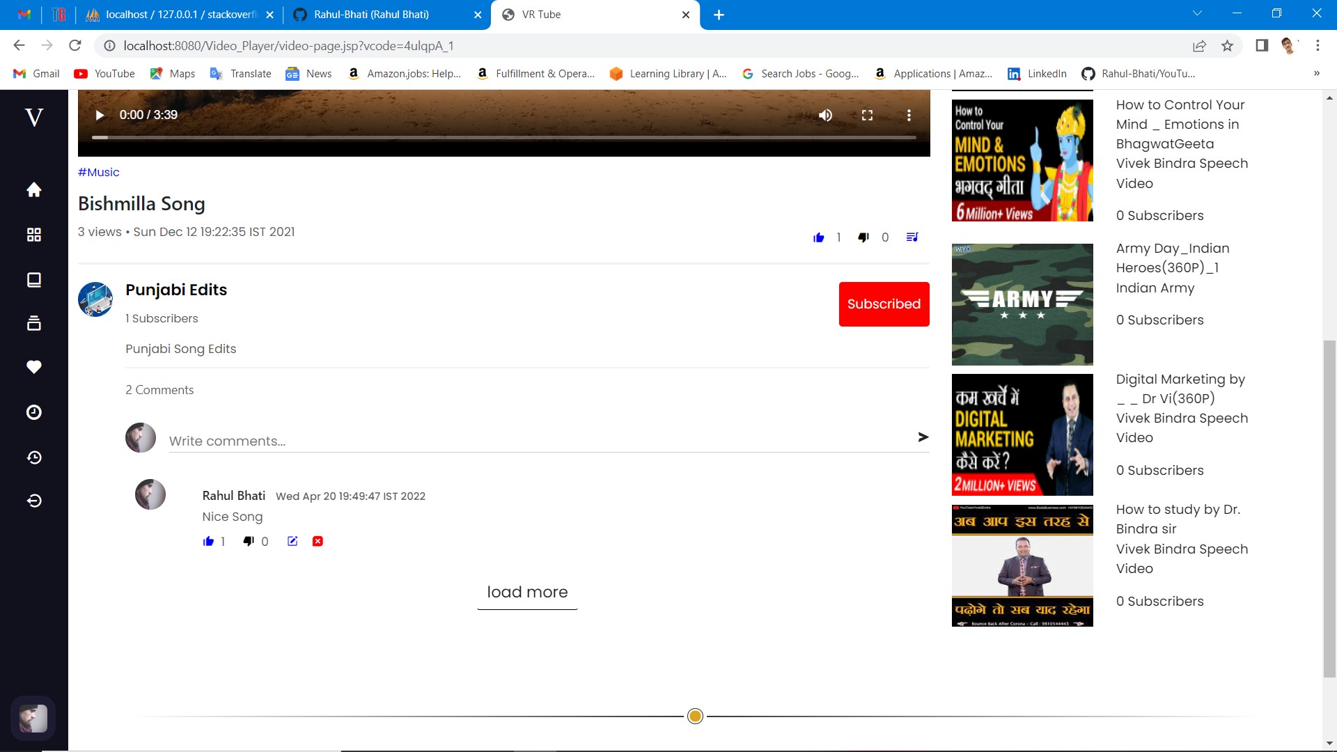 이 프로젝트에서는 비디오를보고 채널을 만들 수 있습니다. 비디오를 업로드 할 수 있습니다. 싫어하고 다른 채널을 구독하는 것을 좋아할 수도 있습니다. JSP를 사용하여 YouTube와 같은 사이트를 사용합니다. 또한이 프로젝트에서 HTML, CSS, JQuery, JavaScript, 부트 스트랩을 사용합니다.