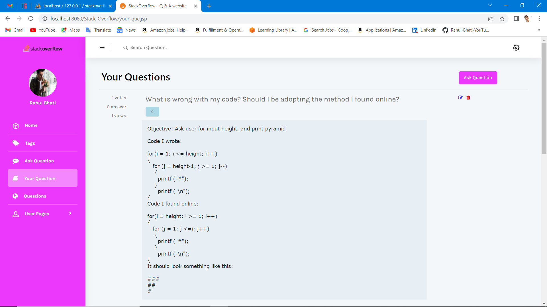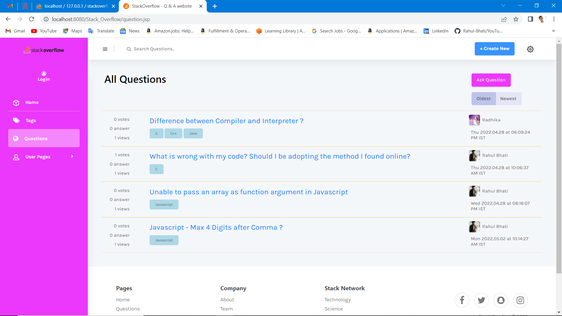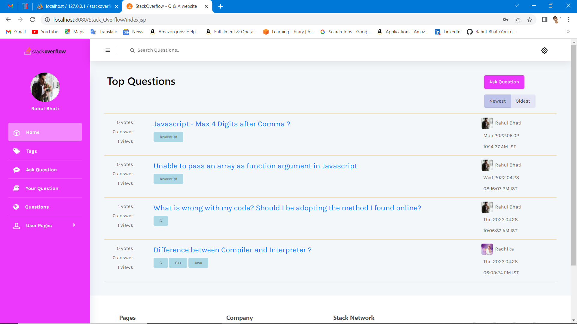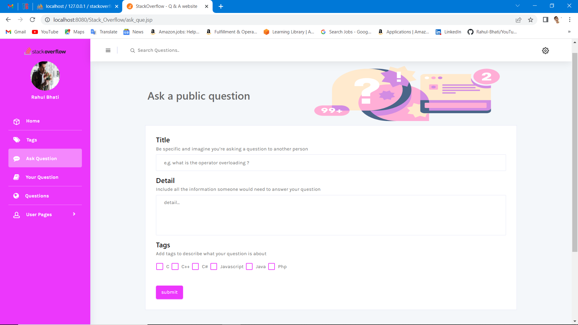 이 웹 사이트는 질문을 할 수있는 Q & A 웹 사이트입니다. 또한 귀하의 답변 웹 사이트는 Design for Design 및 Rahul Bhati가 수행 한 모든 백엔드 작업을 사용하여 작성됩니다.
