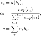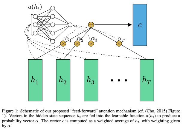 학습 가능한 함수 인 함수 a 는 피드 포워드 네트워크 로 인식됩니다. 이 제형에서, 상태 서열 h 의 적응 가중 평균을 계산함으로써 입력 시퀀스의 고정 길이 포함 c 생성하는 것으로주의를 기울일 수있다.