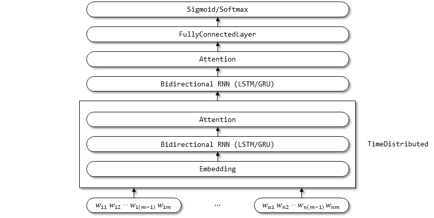 임베딩, 양방향 RNN 및주의 레이어의 매개 변수는 시간 단계 차원에서 공유 될 것으로 예상되기 때문에 시간 분포 래퍼는 여기서 사용됩니다.