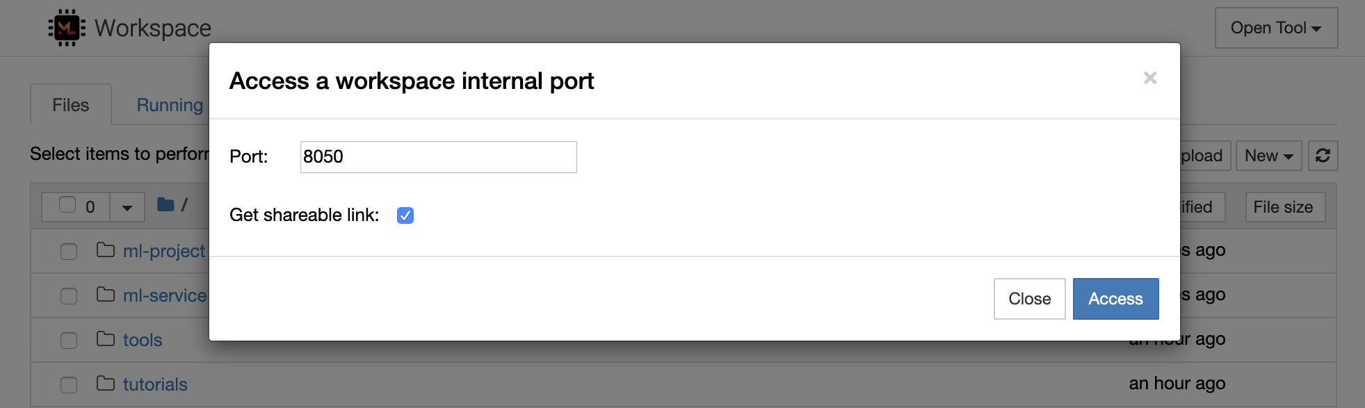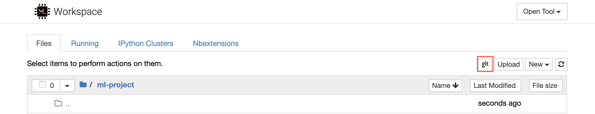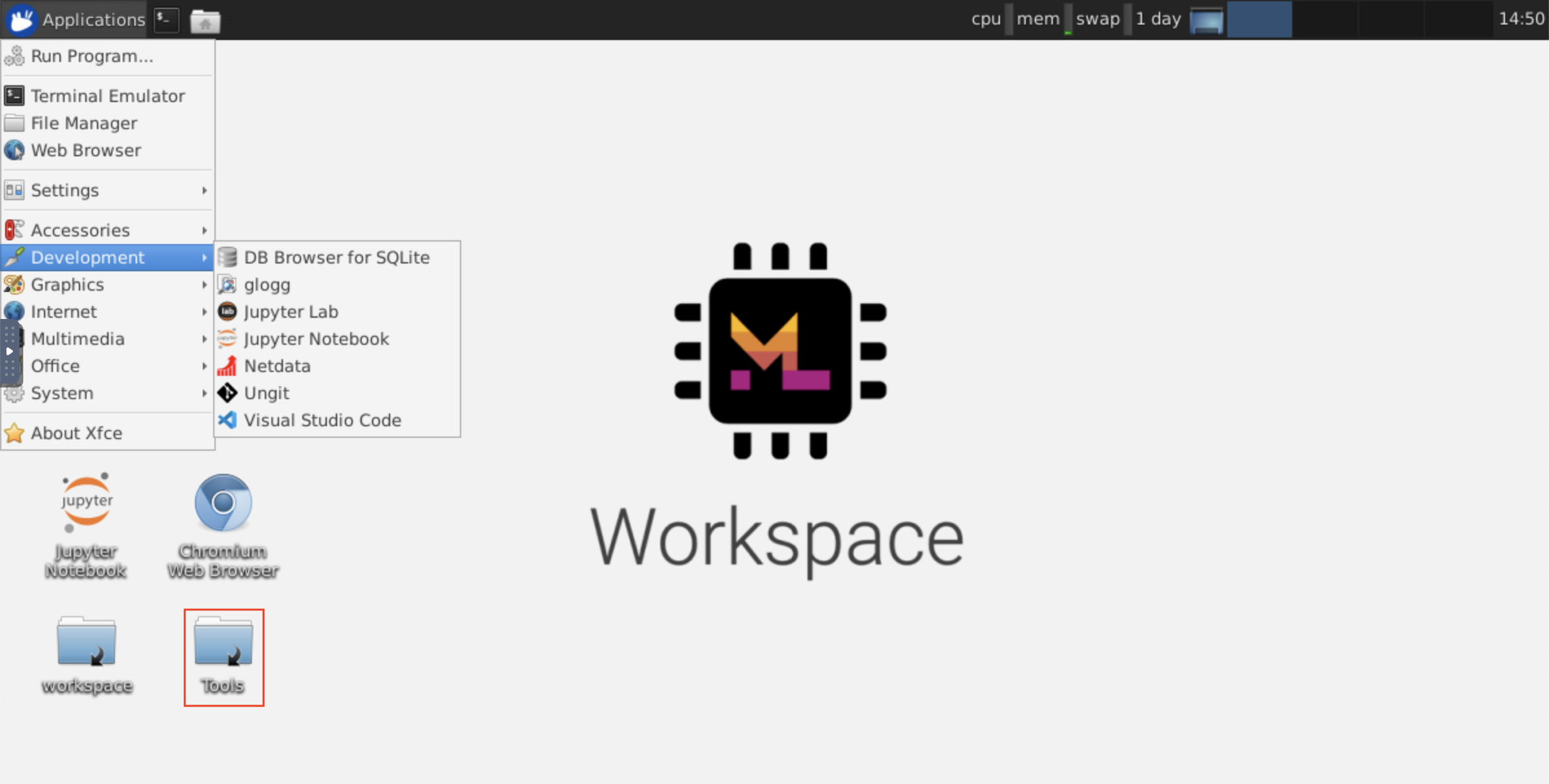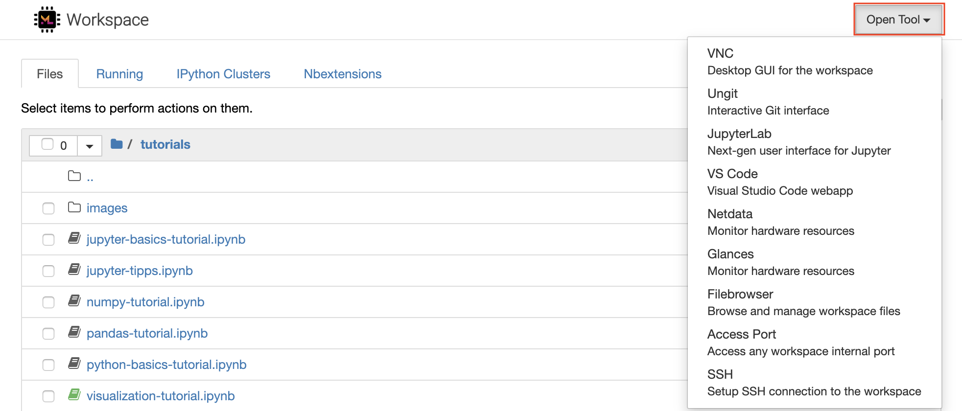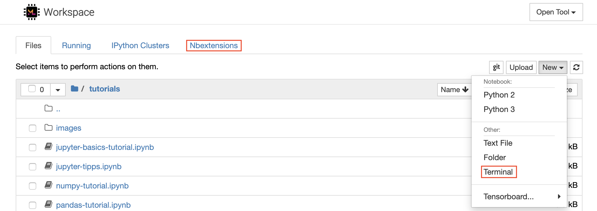 작업 공간에는 기계 학습 워크 플로에 도움이되는 수업 중 가장 오픈 소스 개발 도구가 장착되어 있습니다. 이러한 도구 중 다수는 Jupyter (작업 공간의 주요 응용 프로그램)의 Open Tool 메뉴에서 시작할 수 있습니다.