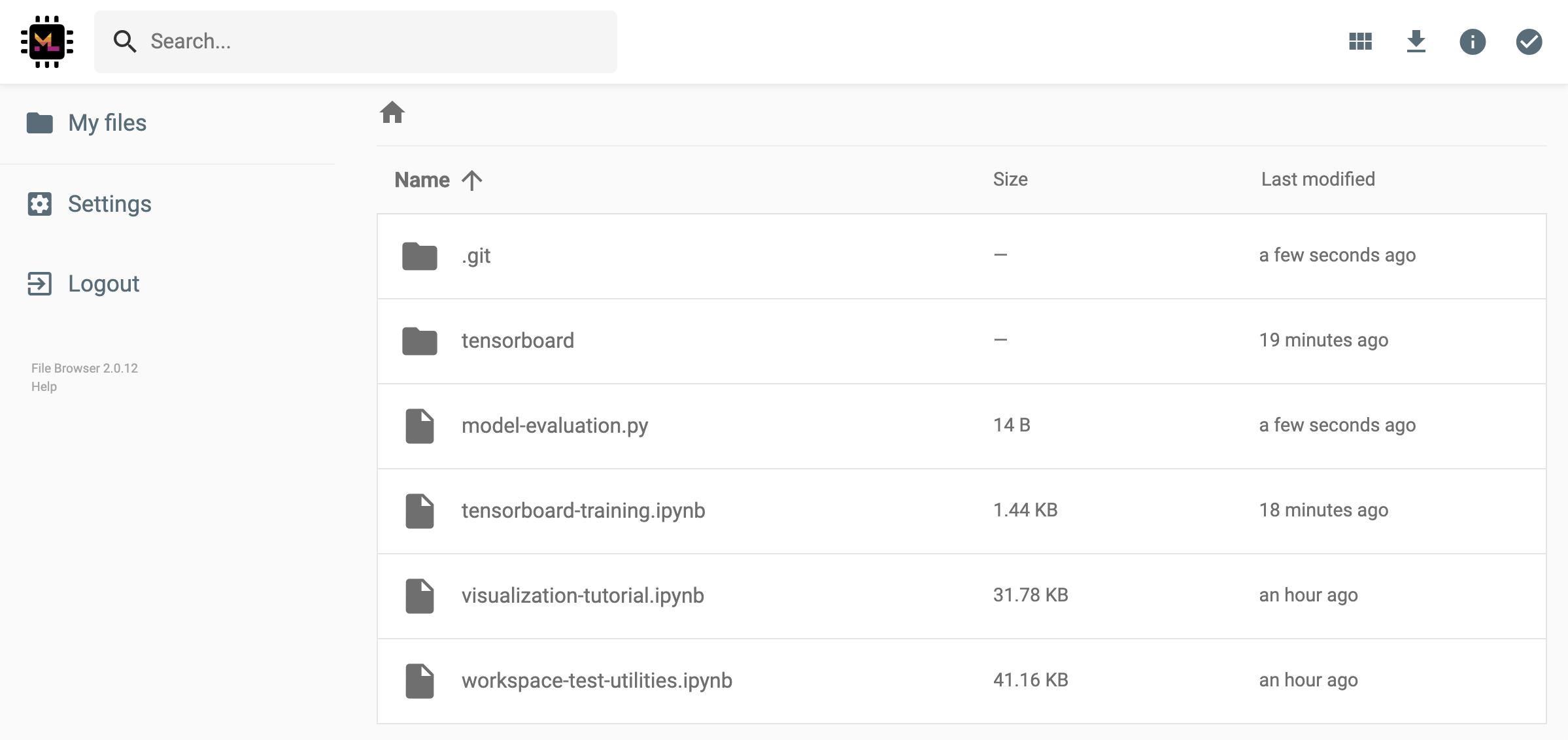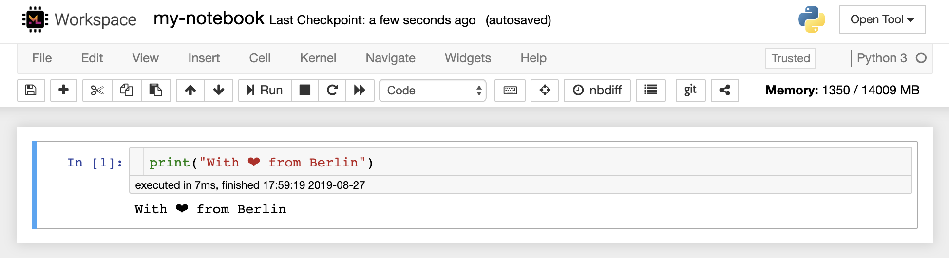 Jupyter Notebook은 코드 작성 및 실행을위한 웹 기반 대화식 환경입니다. Jupyter의 메인 빌딩 블록은 파일 브라우저, 노트북 편집기 및 커널입니다. 파일 브라우저는 /workspace 디렉토리의 모든 노트북, 파일 및 폴더에 대한 대화식 파일 관리자를 제공합니다.