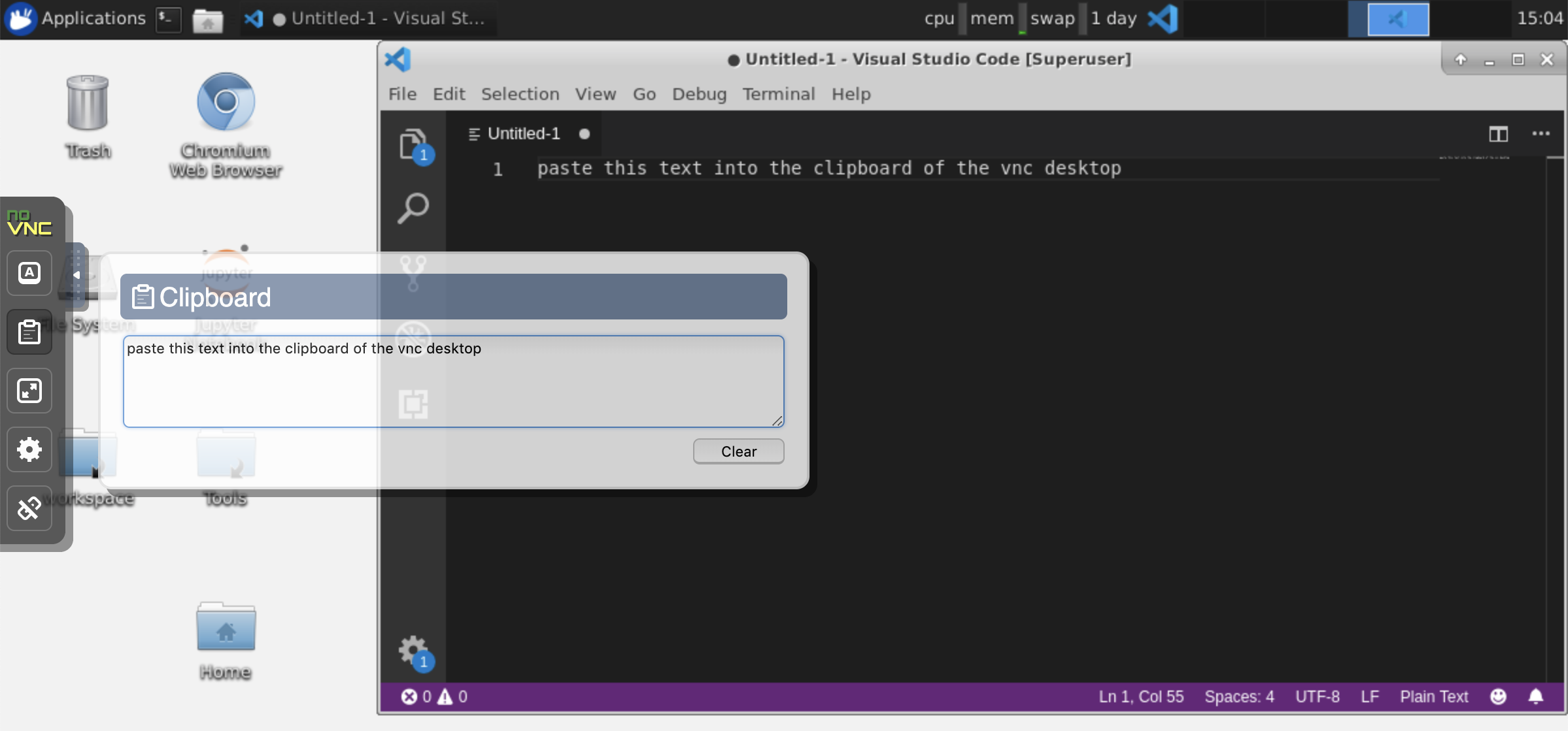 이 작업 공간은 NOVNC를 통해 작업 공간에 대한 HTTP 기반 VNC 액세스를 제공합니다. 따라서 완전 기능을 갖춘 데스크탑 GUI로 작업 공간 내에서 액세스하고 작업 할 수 있습니다. 이 데스크탑 GUI에 액세스하려면 Open Tool 로 이동하여 VNC 선택하고 Connect 버튼을 클릭하십시오. 비밀번호를 요청받은 경우 vncpassword 사용하십시오.