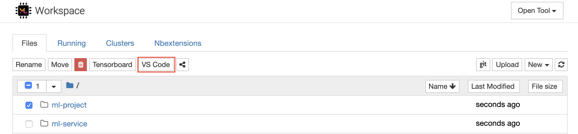 작업 공간은 또한 Jupyter에 VS 코드 통합을 제공하여 아래와 같이 선택한 폴더의 VS 코드 인스턴스를 열 수 있습니다.