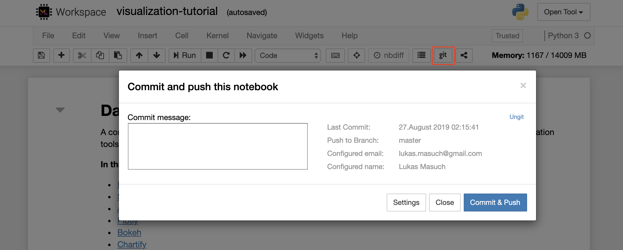 단일 노트북을 원격 git 저장소에 커밋하고 밀려면 다음과 같이 Jupyter에 통합 된 Git 플러그인을 사용하는 것이 좋습니다.