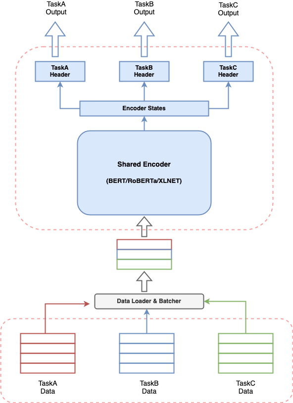 Multi_task_nlp는 NLP 개발자가 여러 작업에 대한 단일 모델을 쉽게 교육하고 추론 할 수있는 유틸리티 툴킷입니다. 우리는 대부분의 NLU 작업 및 다중 변압기 기반 인코더에 대한 다양한 데이터 형식을 지원합니다 (예 : Bert, Distil-Bert, Albert, Roberta, Xlnet 등).