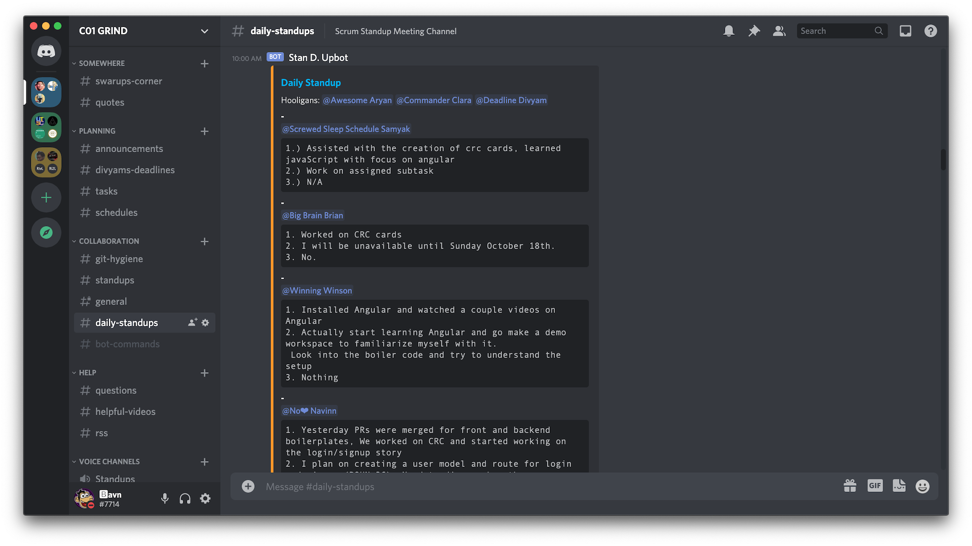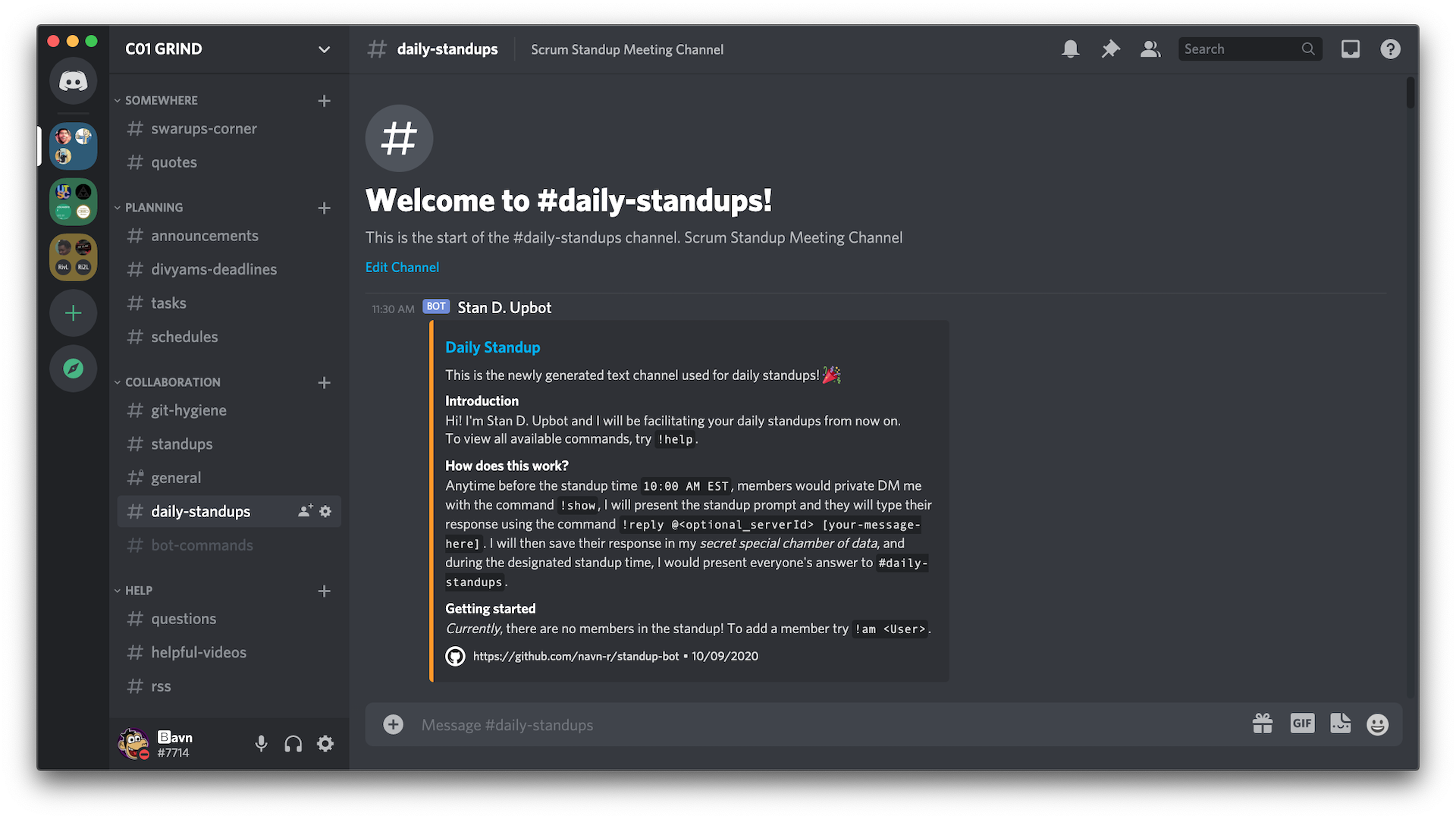 그런 다음 봇은 서버의 MongoDB 데이터베이스에서 항목을 작성하고 텍스트 채널 #daily-standups 작성하고 소개를 보냅니다.